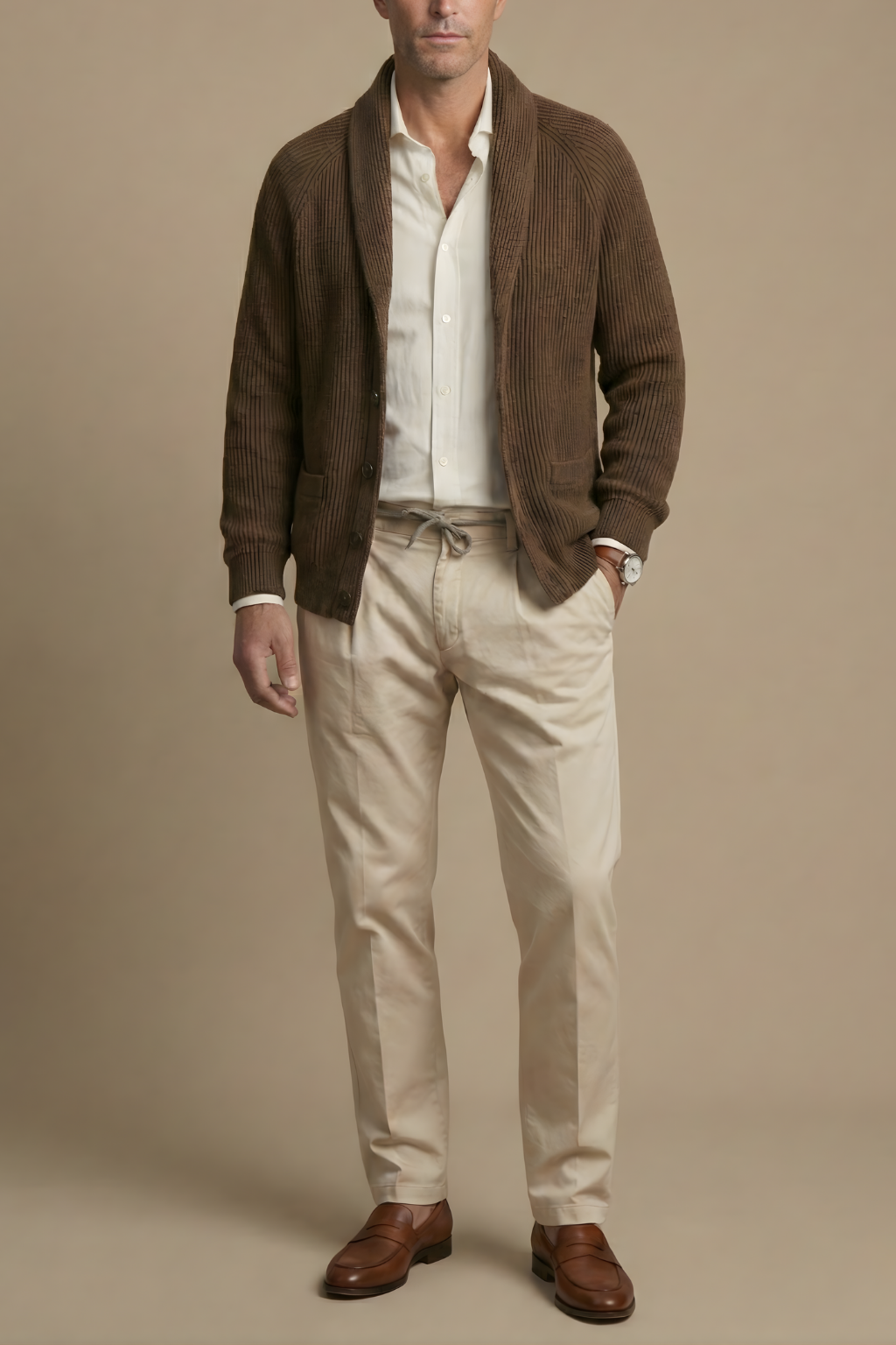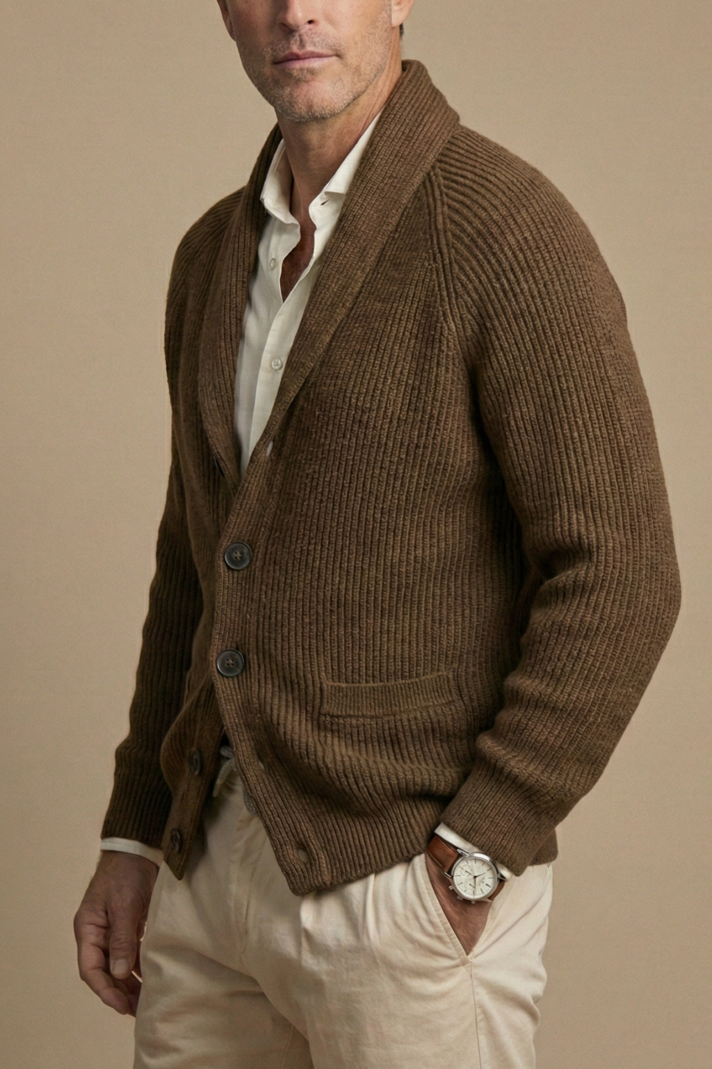 This men’s knitted cardigan features a ribbed knit construction with a shawl-style collar and a button-front closure. The design includes long sleeves with ribbed cuffs, a straight hem, and two front patch pockets. The cardigan is unlined and constructed with a structured knit pattern throughout.
