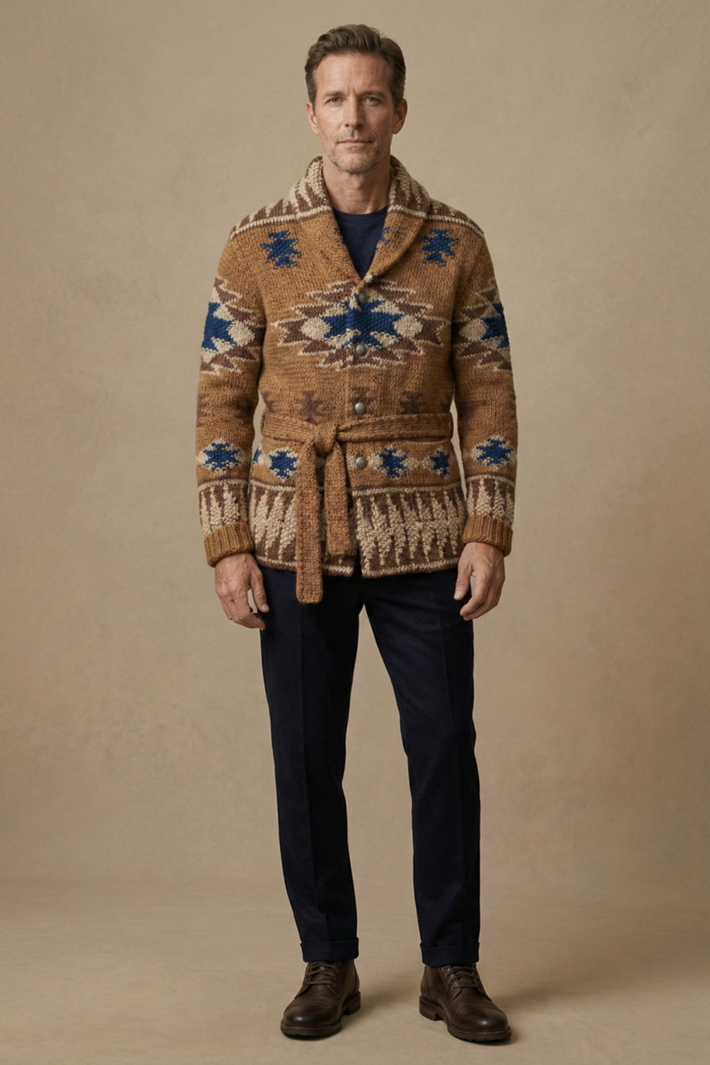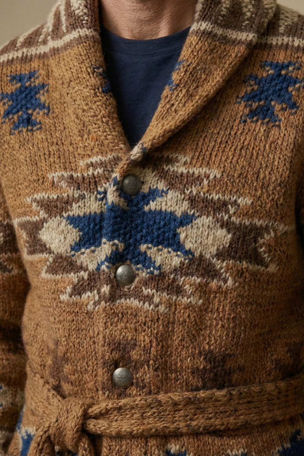 A men’s hip-length cardigan designed with a shawl collar and a structured knit construction. The front features a full button fastening, while a self-tie belt detail defines the waist. Long sleeves, ribbed cuffs, and a patterned knit surface run throughout, finished with a straight hemline and reinforced edges.