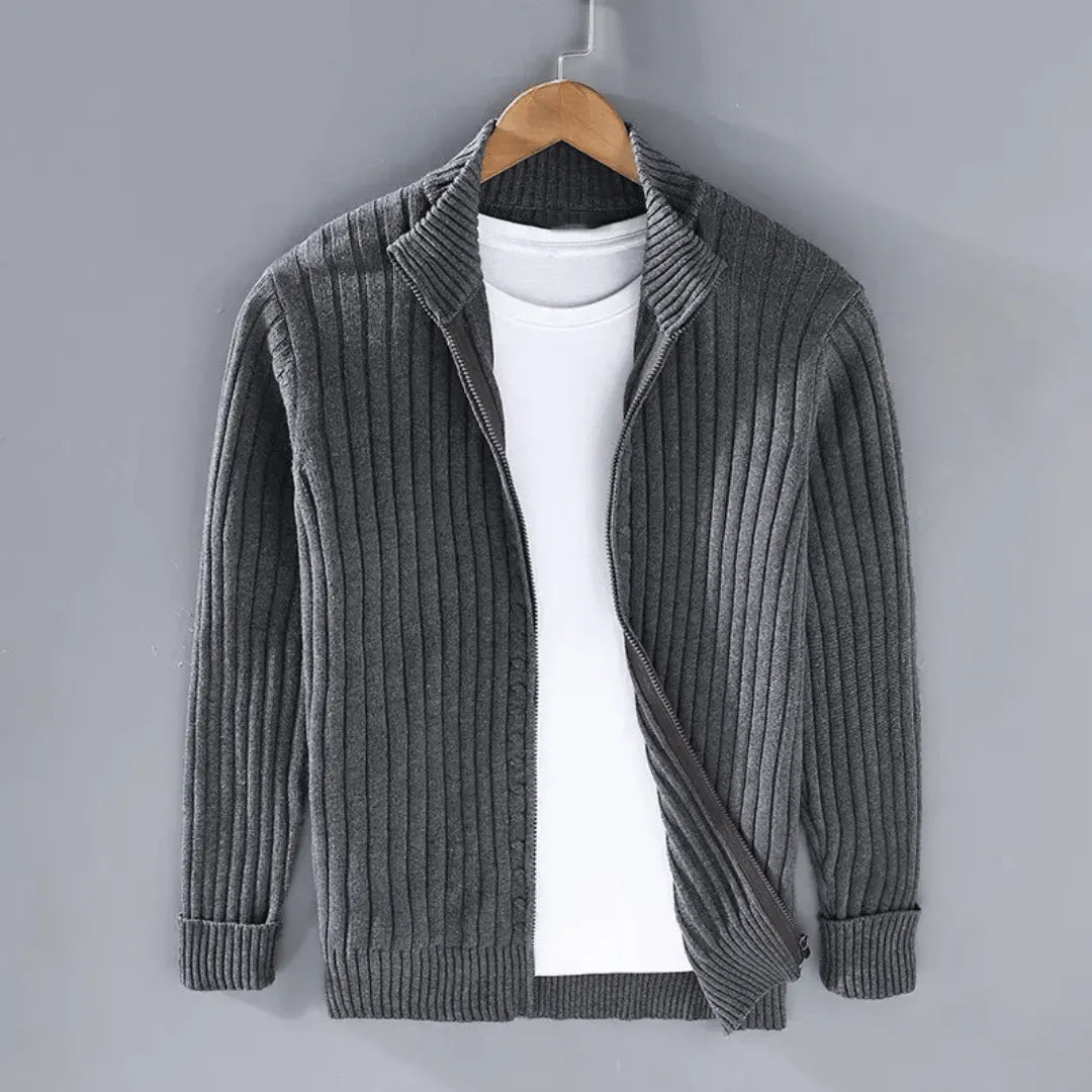 The cooler months call for a layer that works as hard as you do. This ribbed knit cardigan features a full-length zip closure and a structured stand collar, offering a clean, put-together look that moves from the weekend to the office without missing a beat. Ribbed cuffs and a textured knit construction give it a considered, tailored finish that pairs effortlessly with a tee or a collared shirt underneath.