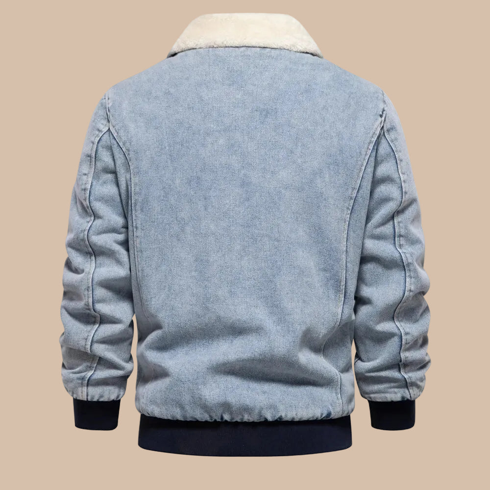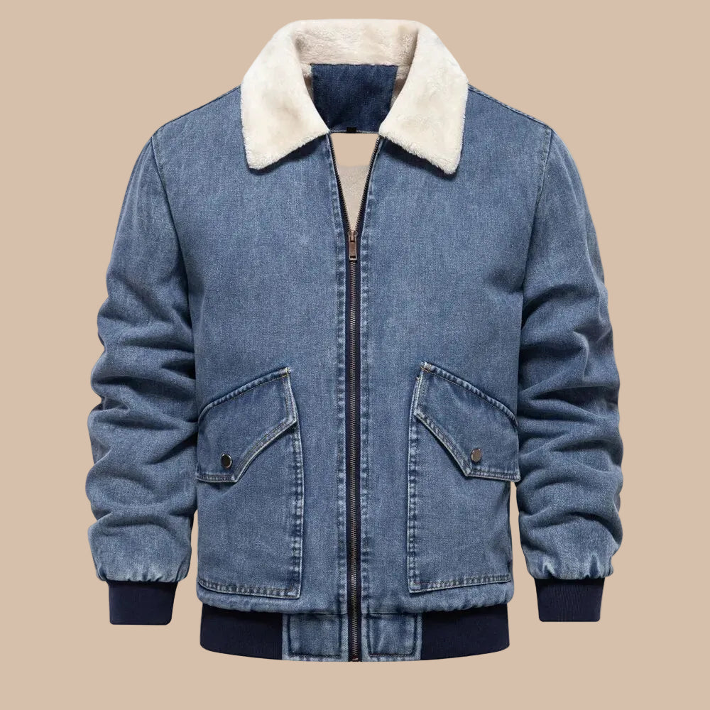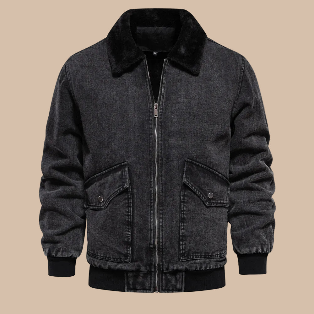 This men’s jacket features a full front zip closure and a fold-over collar with contrasting inner lining. The design includes two front patch pockets with flap detailing and visible stitching along the seams. Ribbed cuffs and a ribbed hem complete the structured silhouette, providing a clean and defined finish.