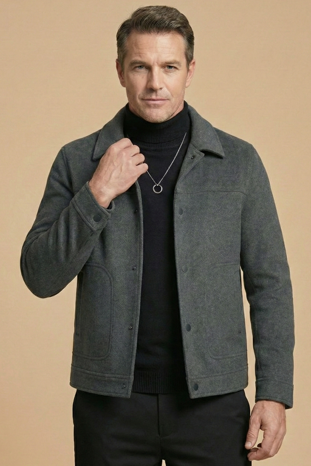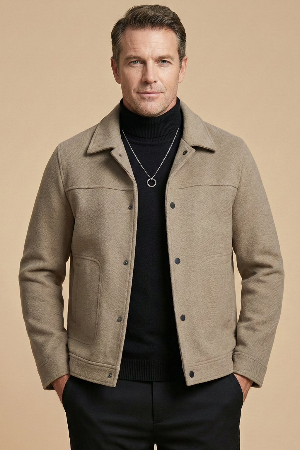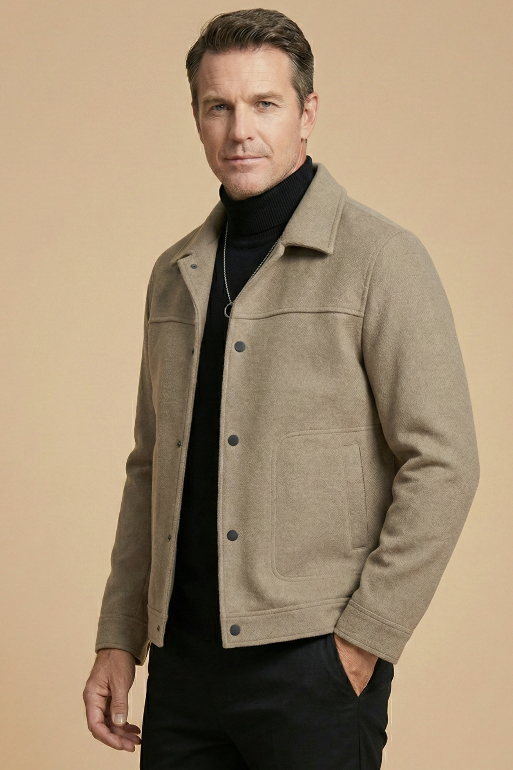 Design: Collared jacket with button front closure, two front patch pockets, long sleeves and straight hem