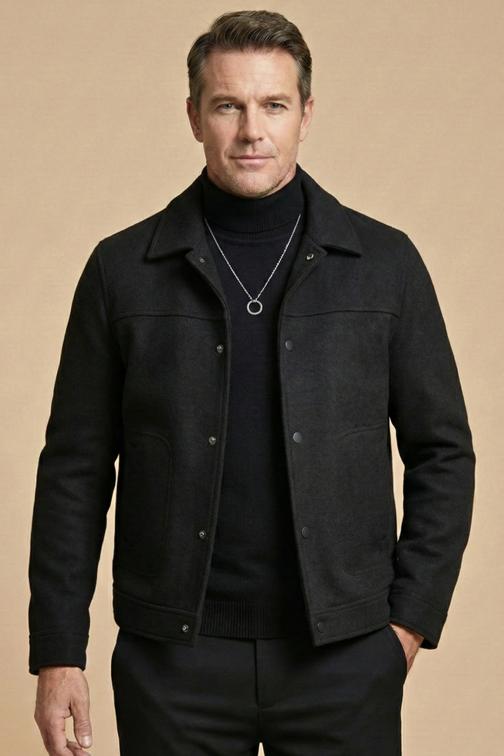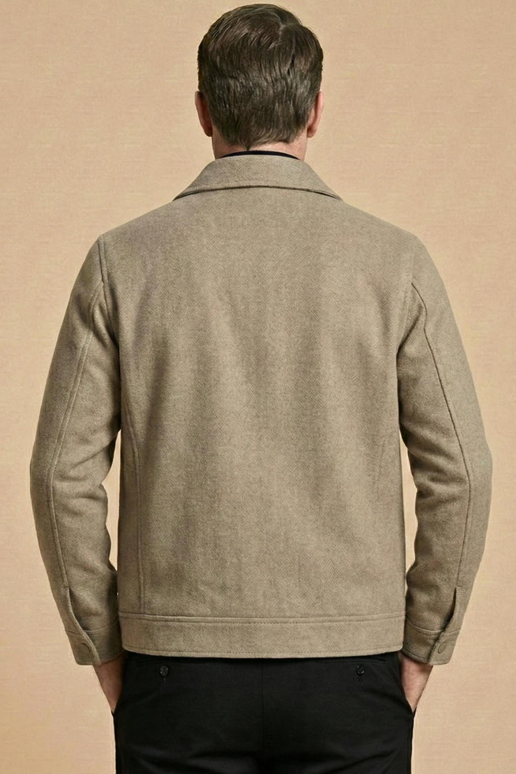 This jacket features a structured silhouette with a classic collar and full button front closure. Designed with two large front patch pockets and a straight hem, it offers a clean, functional look. The interior includes a visible lining panel and inner pocket detail for added practicality.