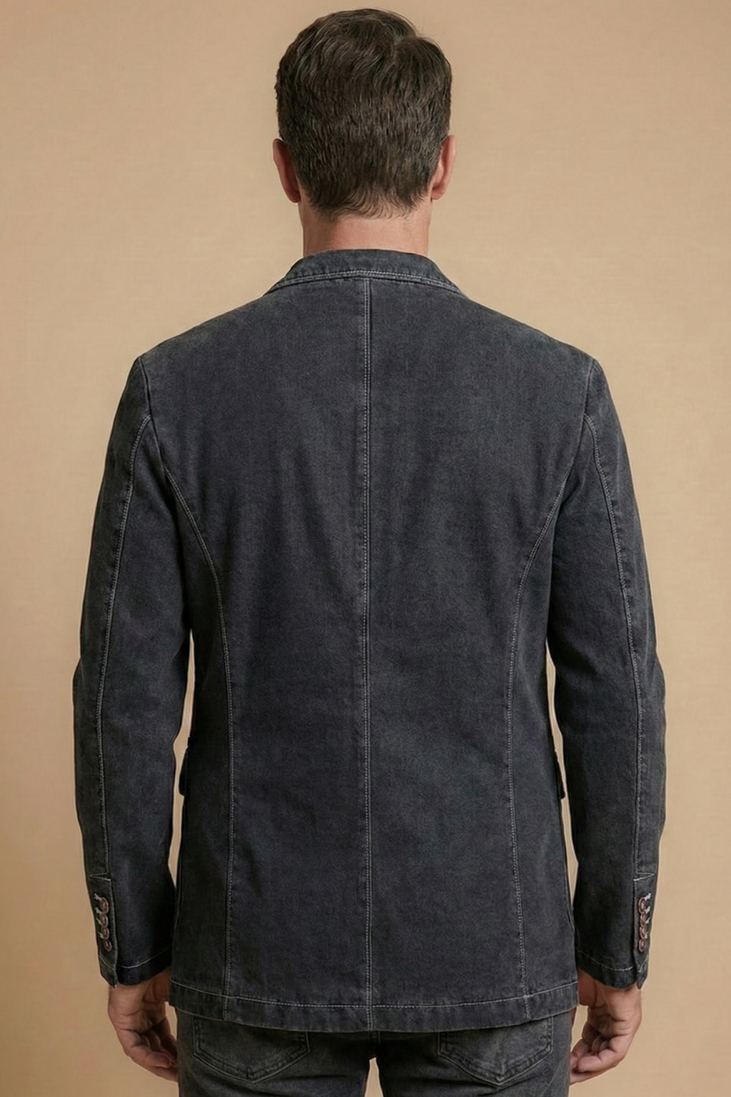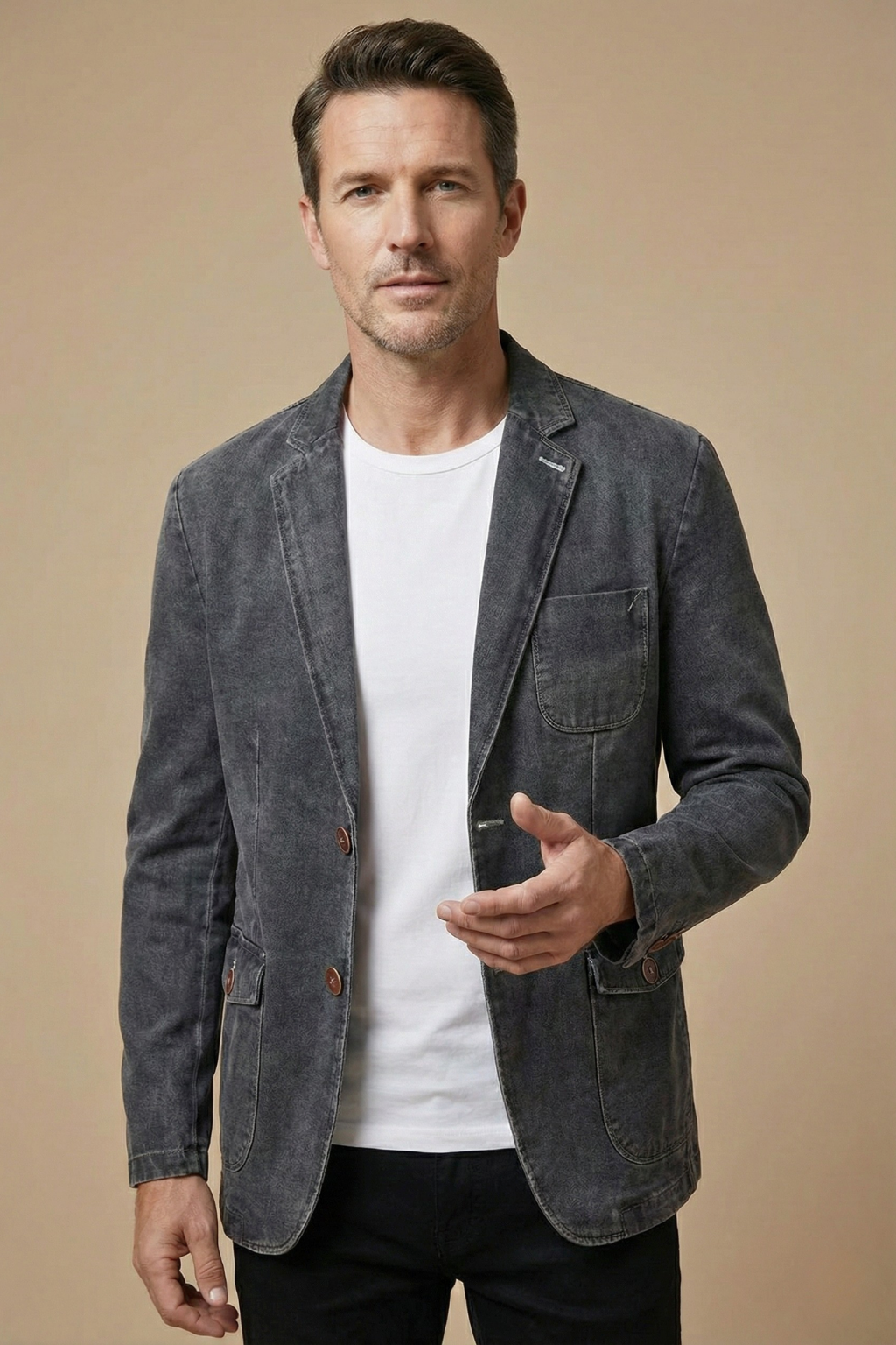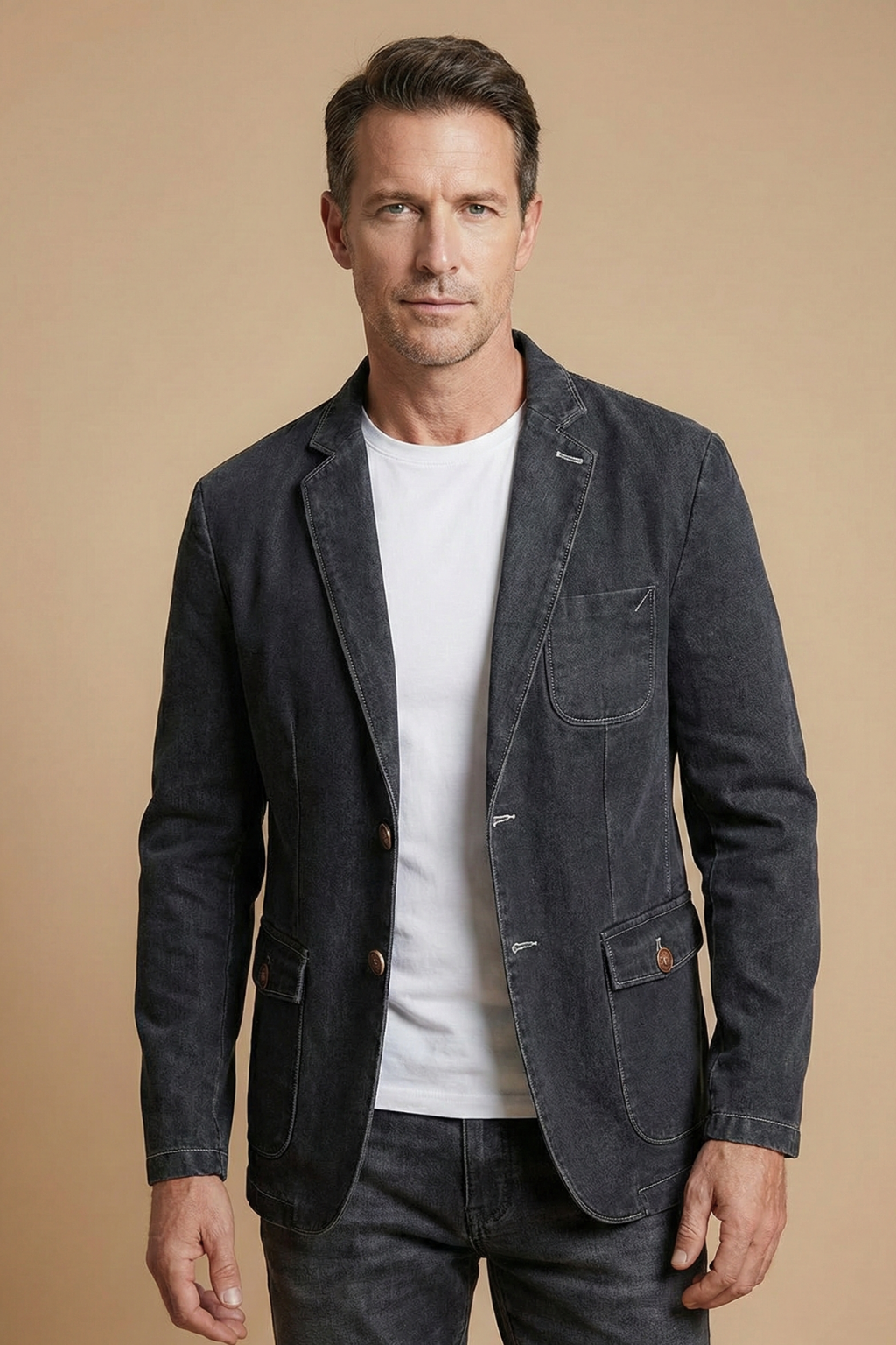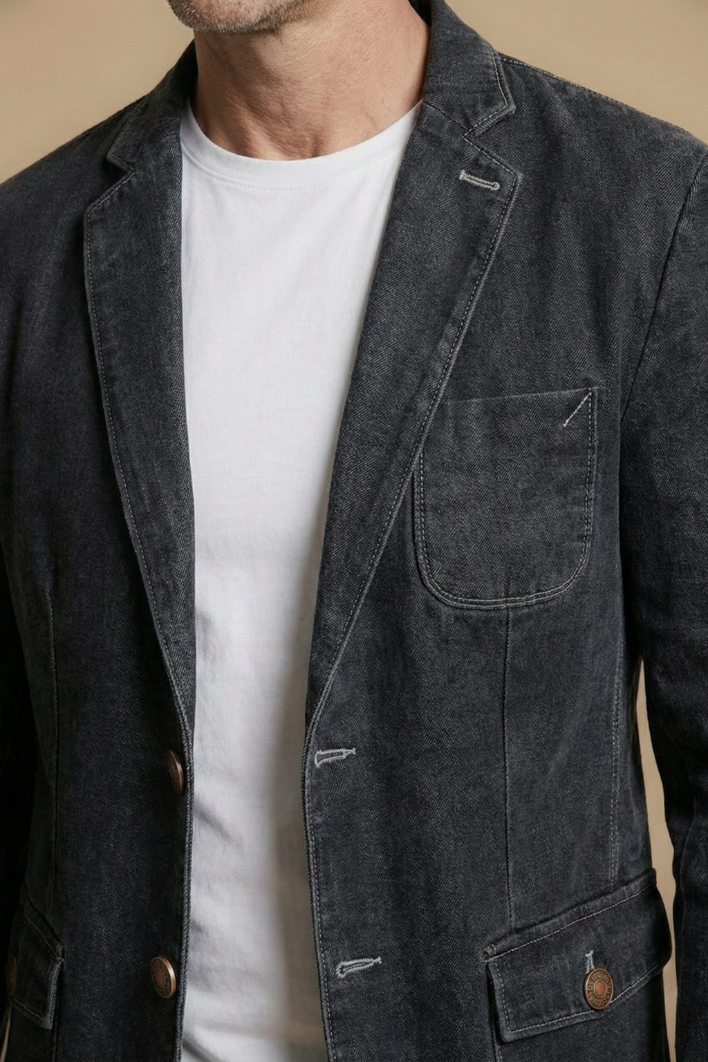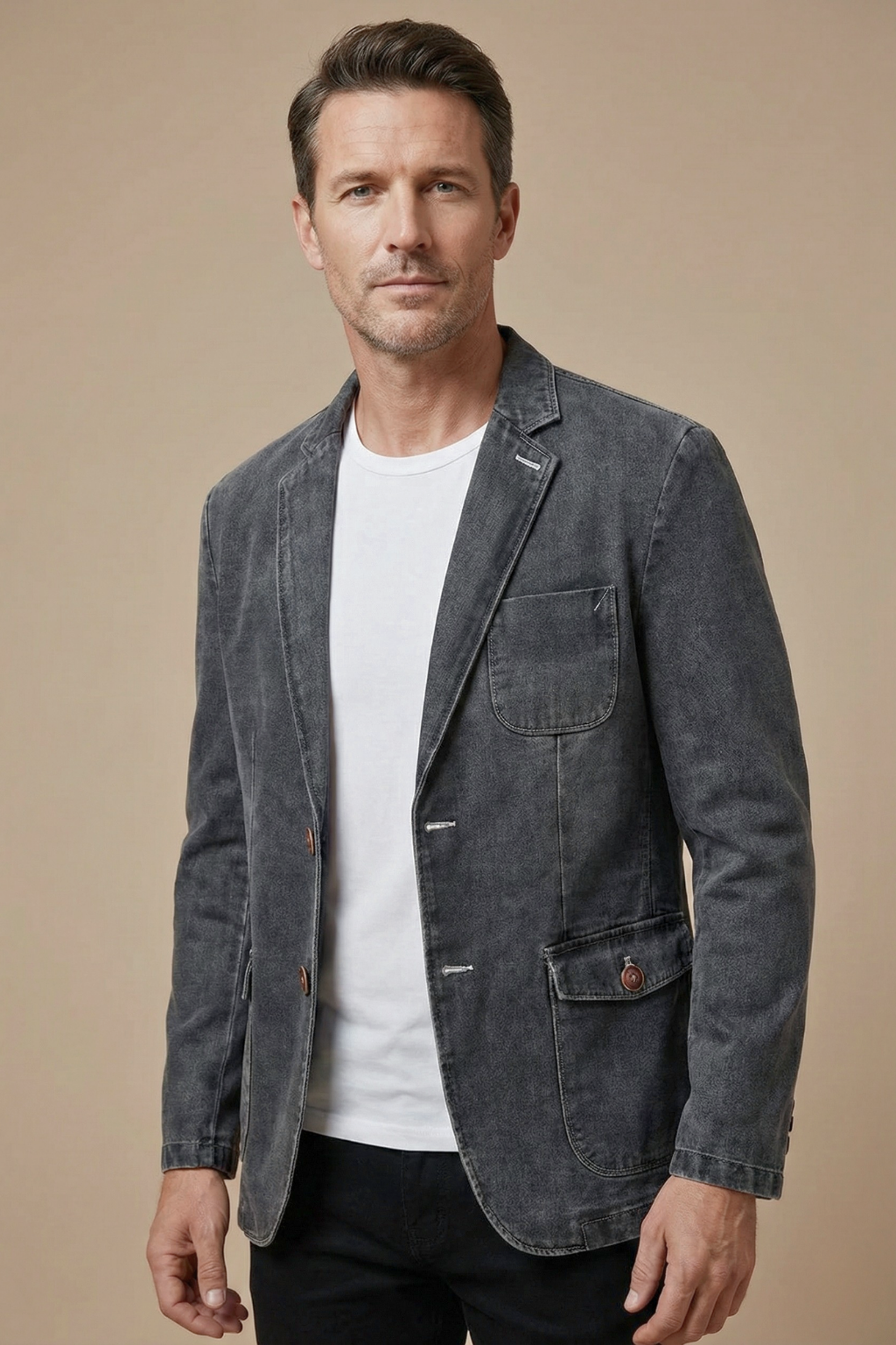 This men’s blazer features a structured silhouette with a notch lapel collar and two-button front closure. The design includes long sleeves with straight cuffs, a chest patch pocket and two front flap pockets with button detail. The interior shows a contrast lining with inner pocket construction and a hip-length hem.