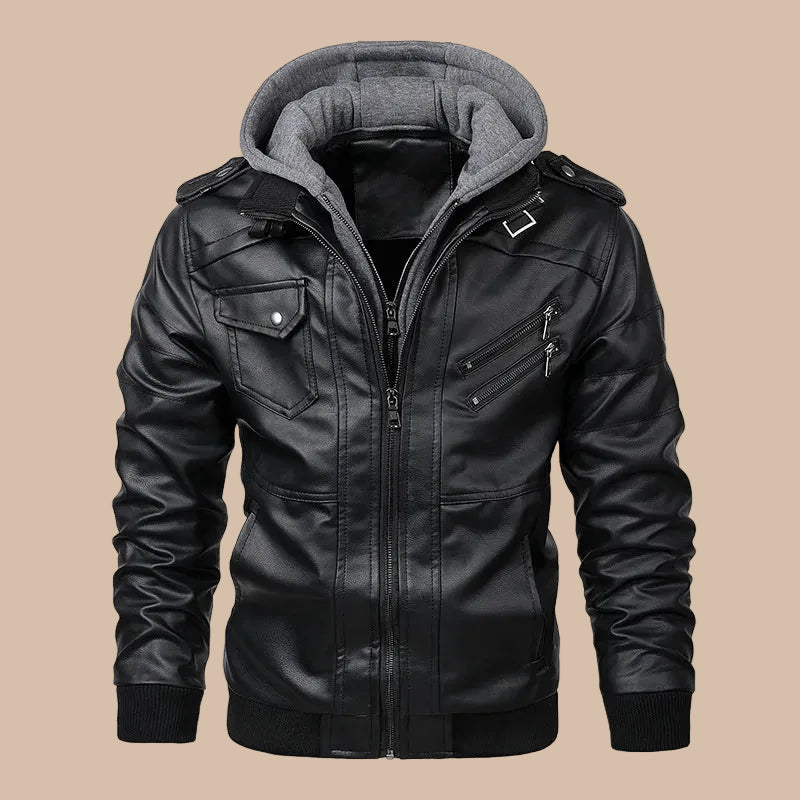 Men's Leather Bomber Jacket - Hooded Zip Front with Shoulder Epaulettes - Multi-Pocket Biker Style and Ribbed Cuff Hem