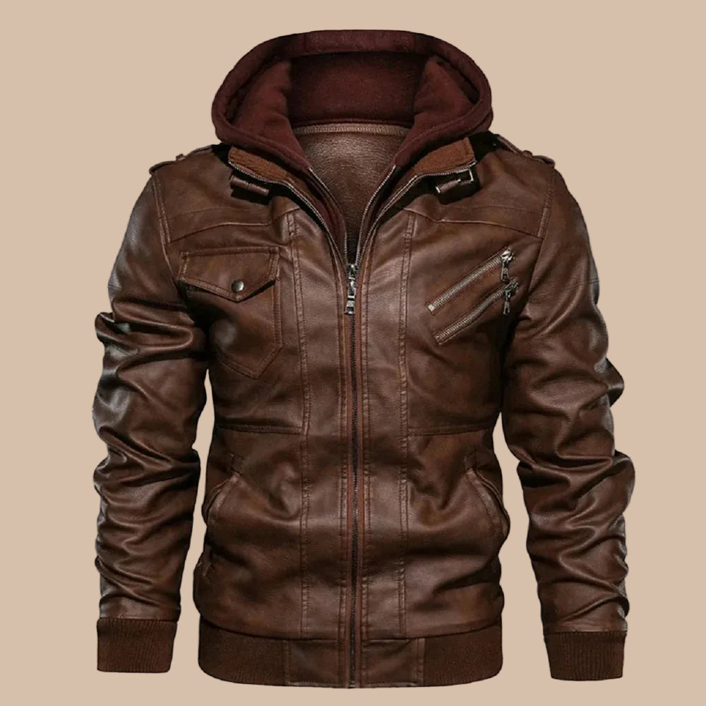 Built for the kind of man who wants his jacket to do more than keep the wind out — the detachable hooded liner, shoulder epaulette straps, and multi-pocket front give this leather bomber a purposeful, layered look that transitions from weekend to smart casual without missing a beat. A chest flap pocket with snap button, diagonal zip chest pocket, and two lower zip hand pockets keep everything within reach, while the ribbed cuffs and hem lock in the silhouette at the waist.