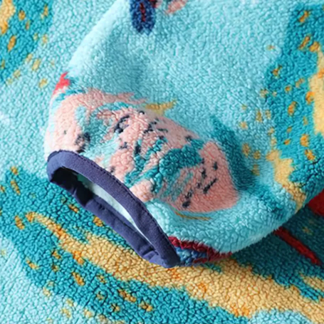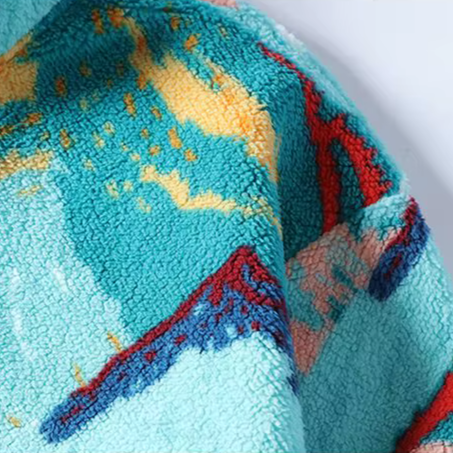 A pullover that brings personality to cold-weather dressing without overthinking it. The all-over abstract landscape print on a plush sherpa fleece construction makes an immediate visual statement, while the stand collar and snap button placket keep the structure clean and unfussy. Drop it over a tee or layer it under a jacket — either way, it holds its own.