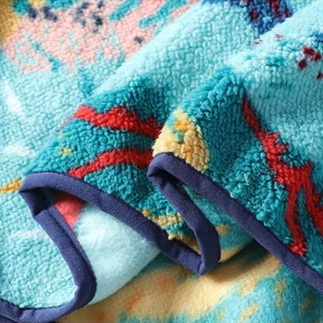 Design: Sherpa fleece pullover with all-over abstract landscape print - stand collar - snap button placket at chest - long sleeves - dropped shoulder - ribbed cuffs and hem
