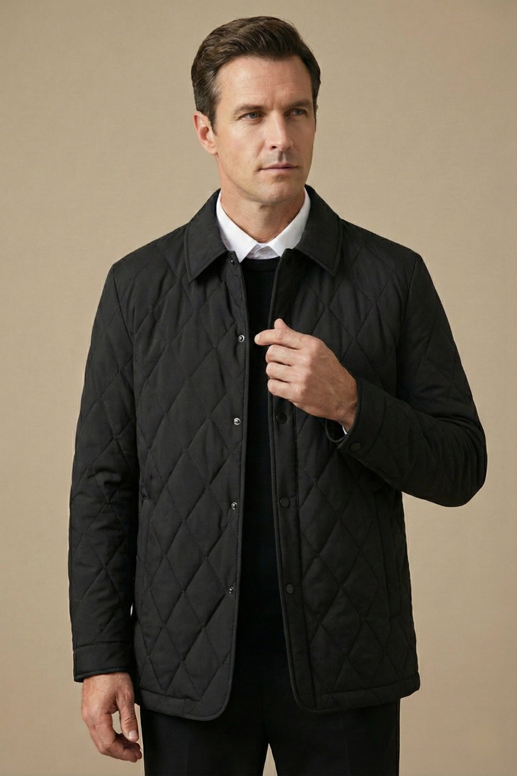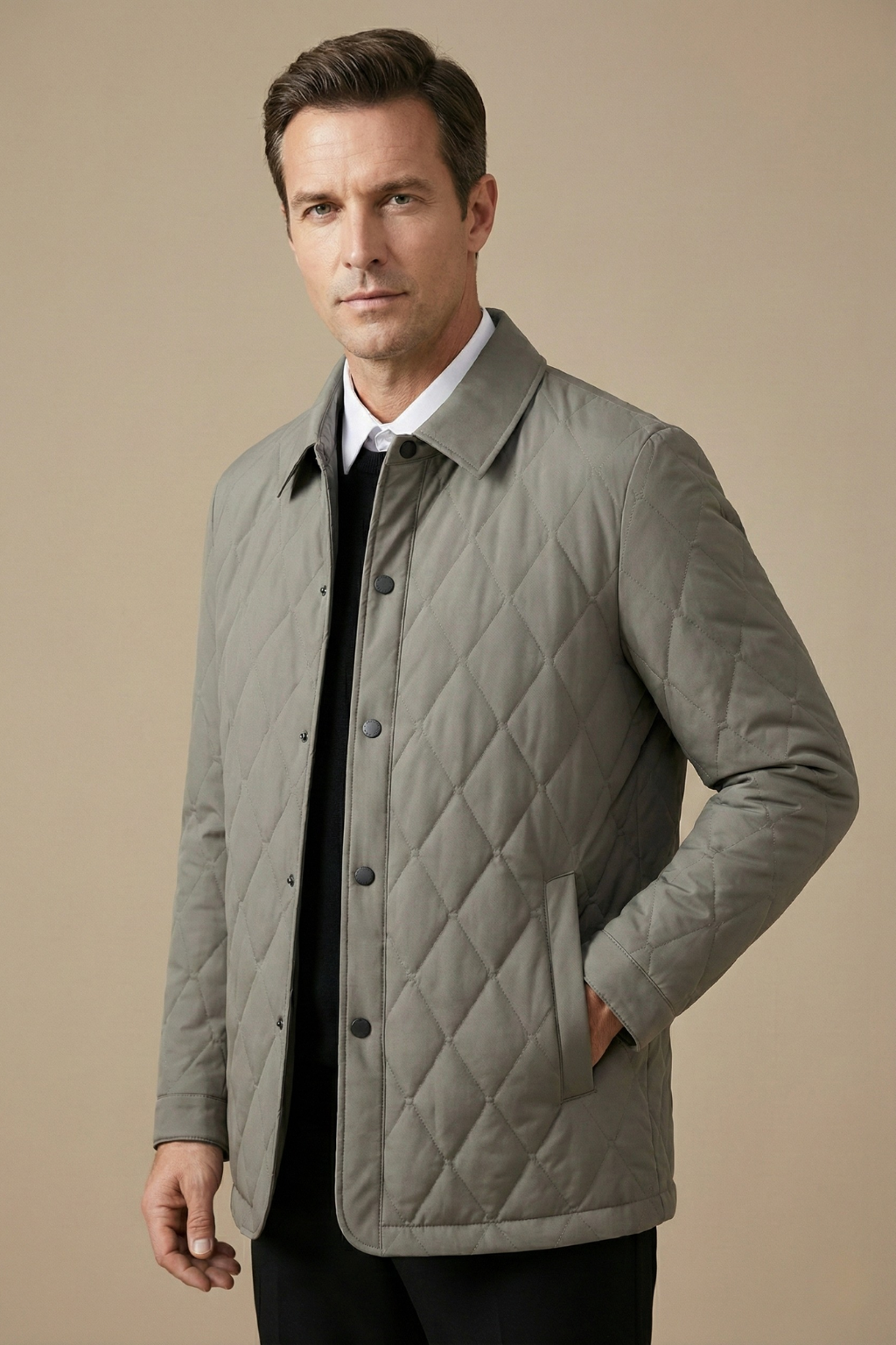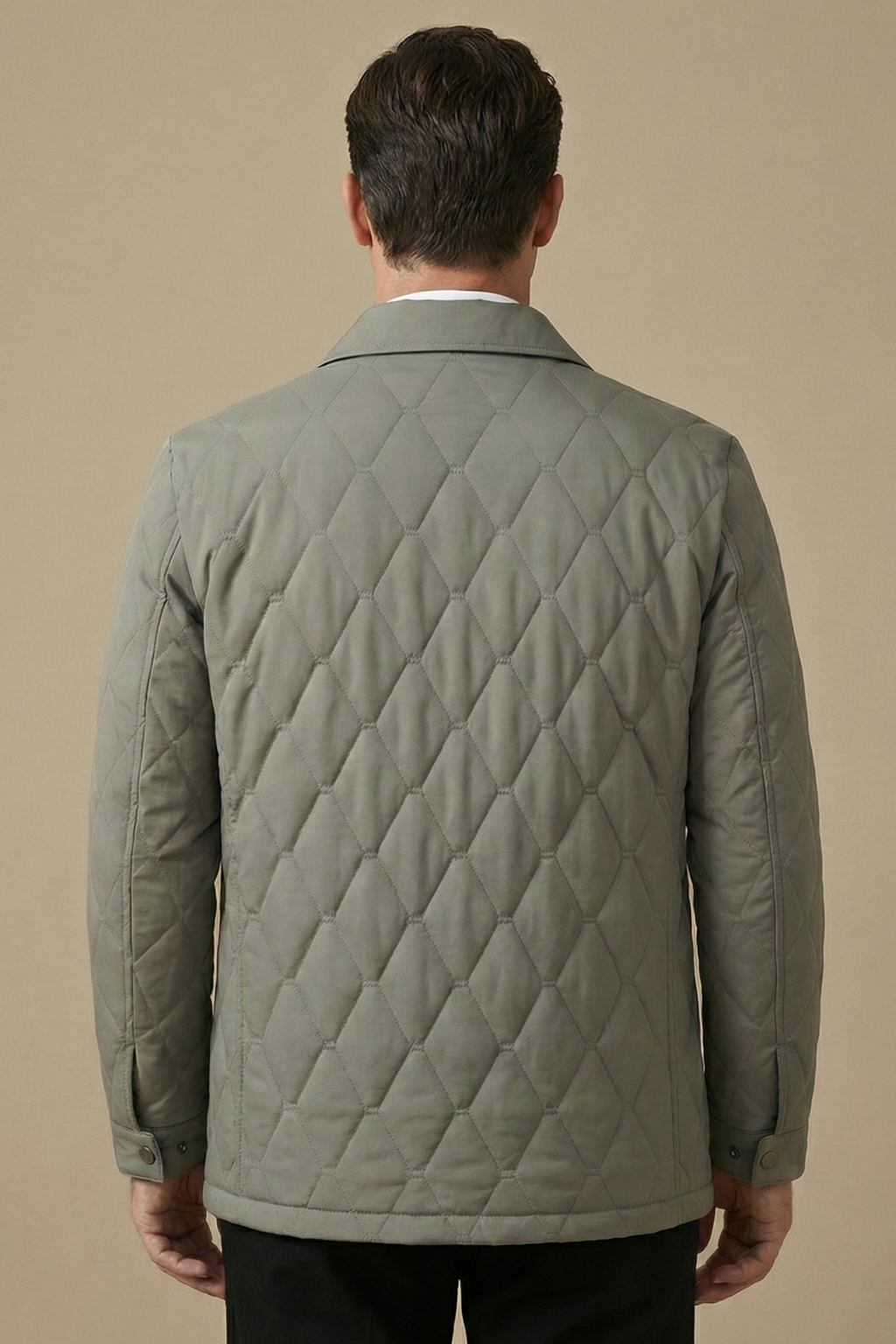 This men’s quilted jacket features a diamond-stitched outer design with a structured pointed collar and snap button front closure. The silhouette includes long sleeves with straight cuffs and two side slip pockets. The interior construction shows contrast quilted lining with panel detailing and inner pocket compartments.