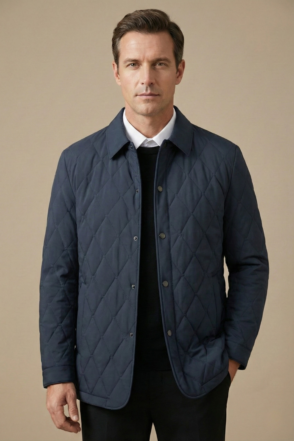 Design: Diamond-quilted jacket with snap button front, pointed collar, long sleeves, straight cuffs, side slip pockets and contrast interior lining with inner pockets