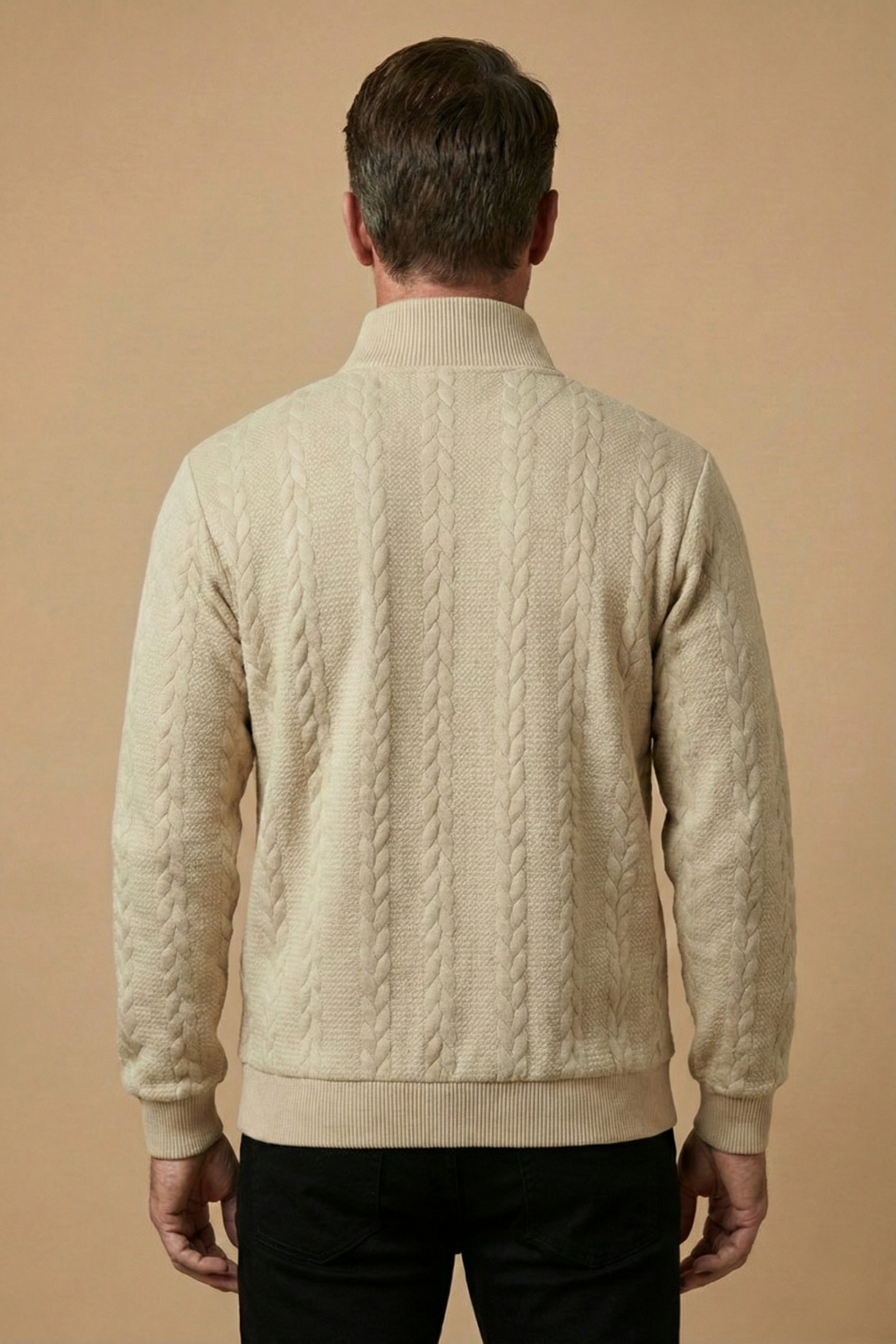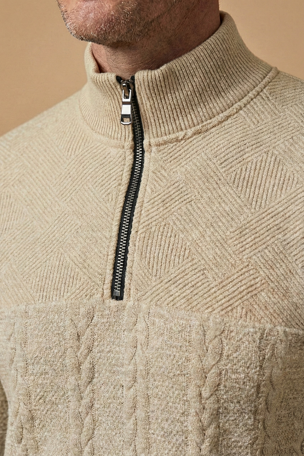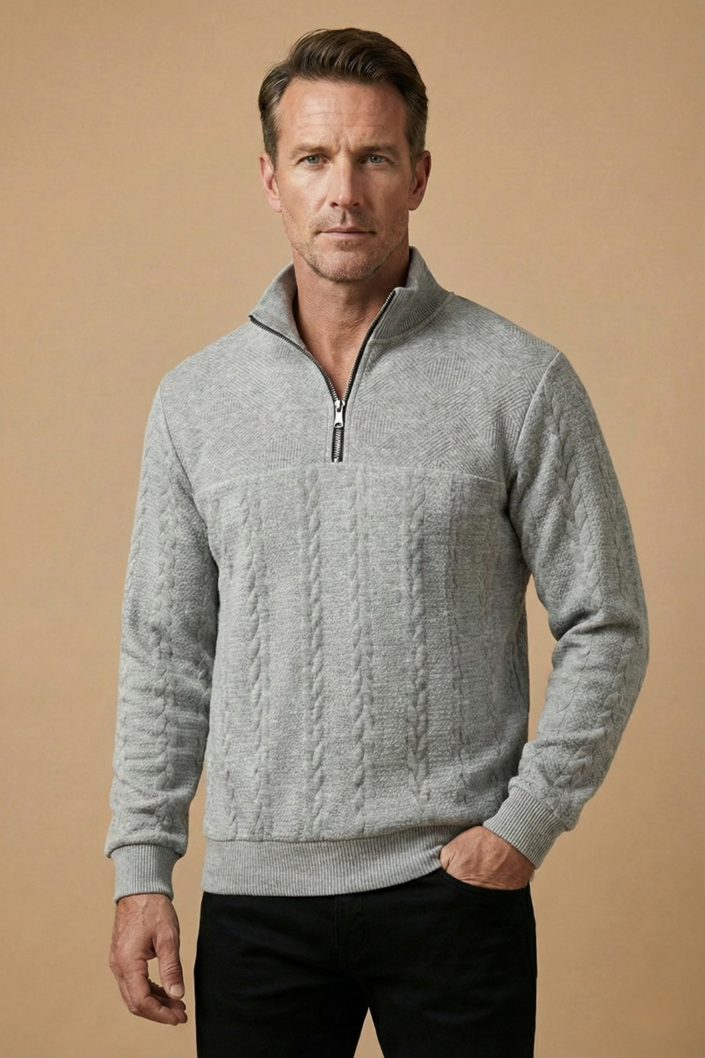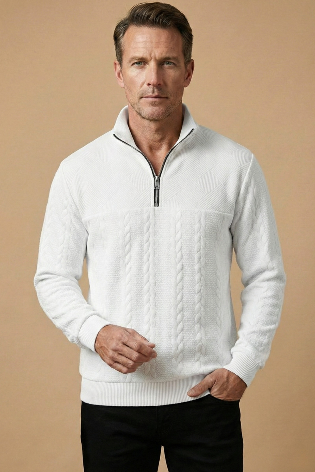 This men’s jumper features a textured cable knit design with a high zip collar for adjustable coverage. Designed with long sleeves and ribbed cuffs and hem, it offers a structured silhouette and clean finish. The quarter zip neckline adds functional detail while maintaining a classic shape.