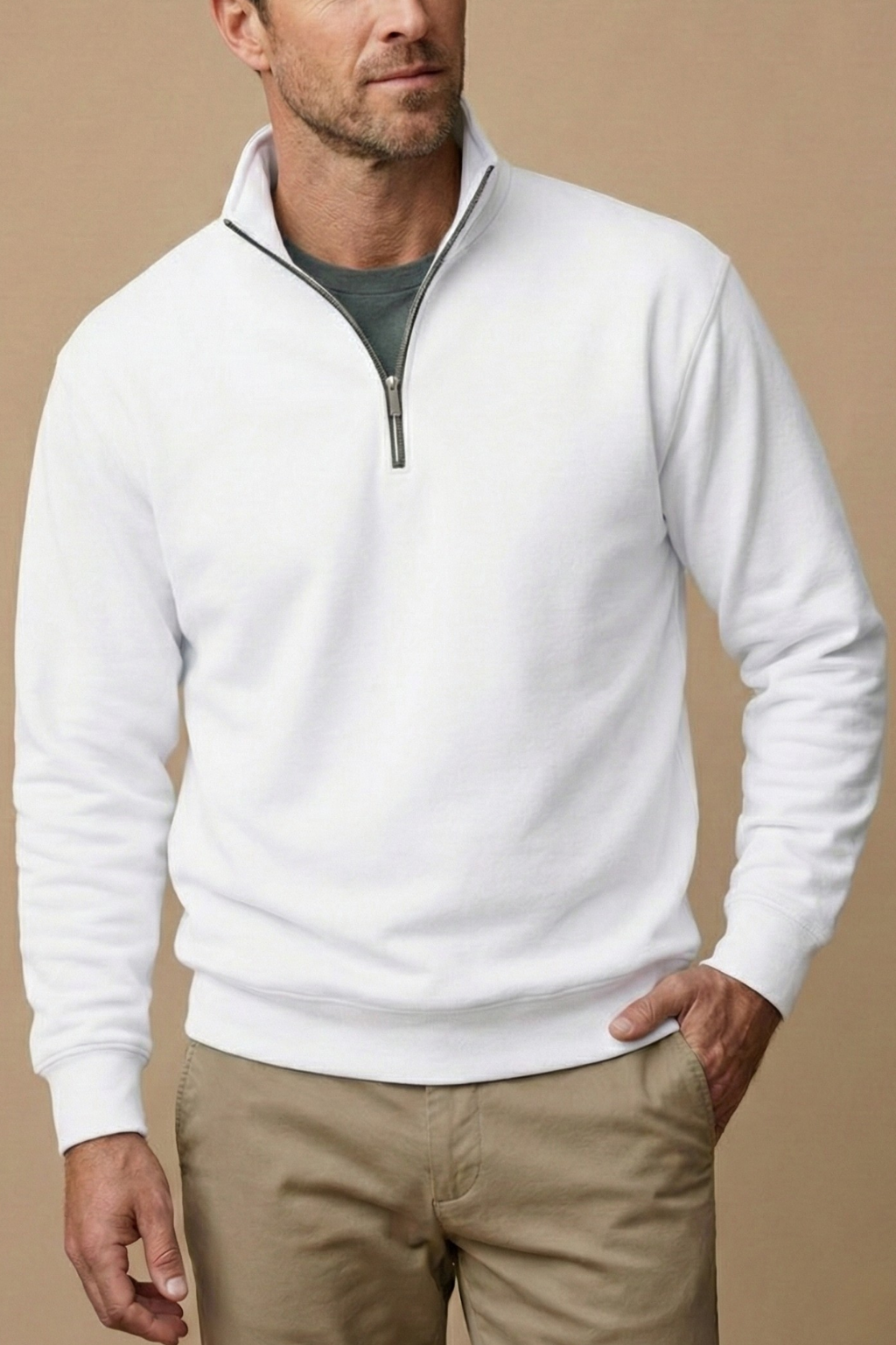A clean, structured design featuring a stand collar with a short quarter zip closure at the front. The long sleeves and straight hem create a streamlined silhouette suited for layering, while the minimal finish keeps the look versatile. Designed as a practical mid-layer for everyday wear.