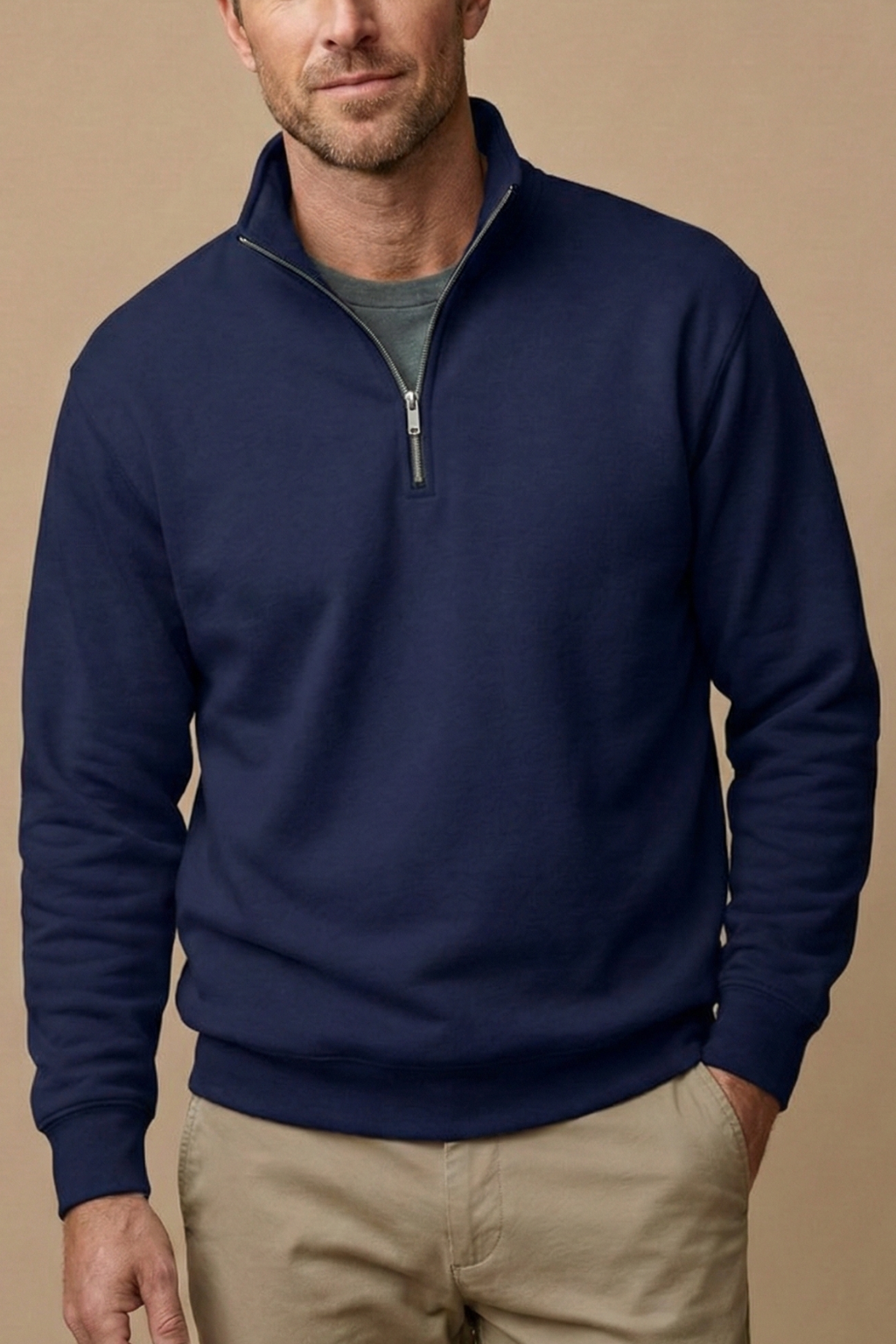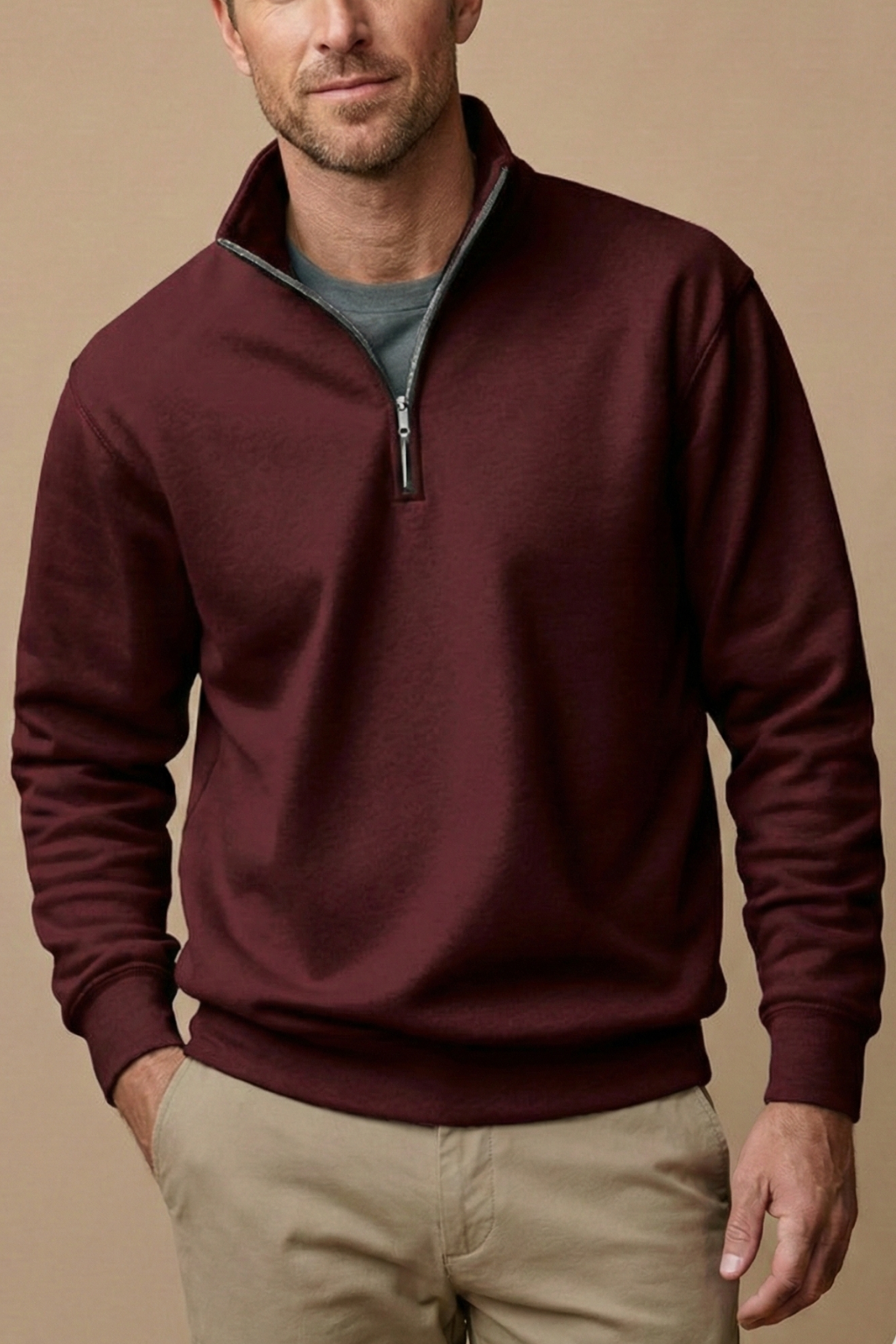 Design: Long sleeve pullover with stand collar and quarter zip closure