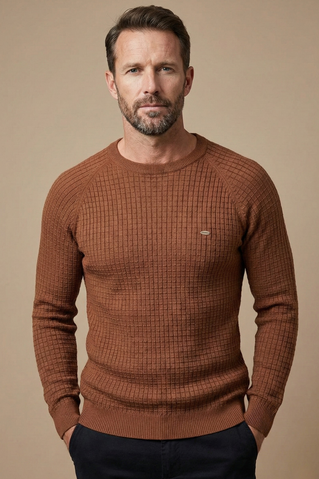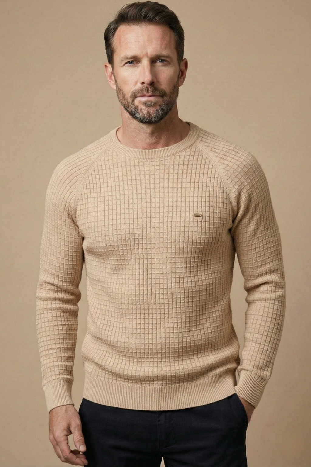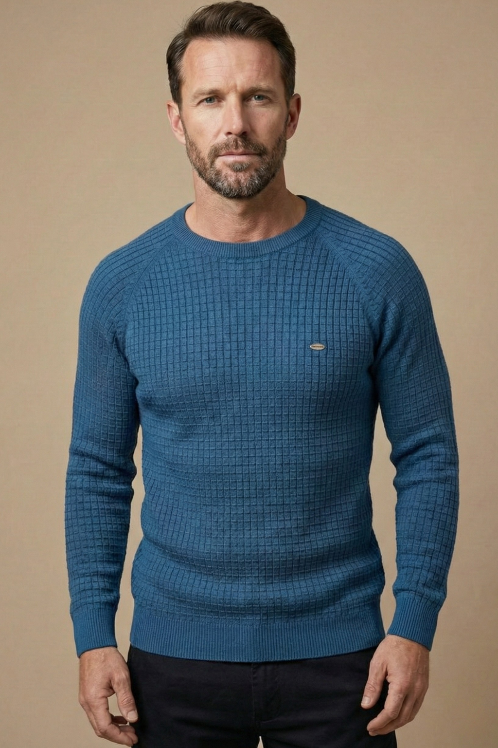 Men’s Textured Knit Jumper – Long Sleeve Crew Neck with Ribbed Cuffs and Hem