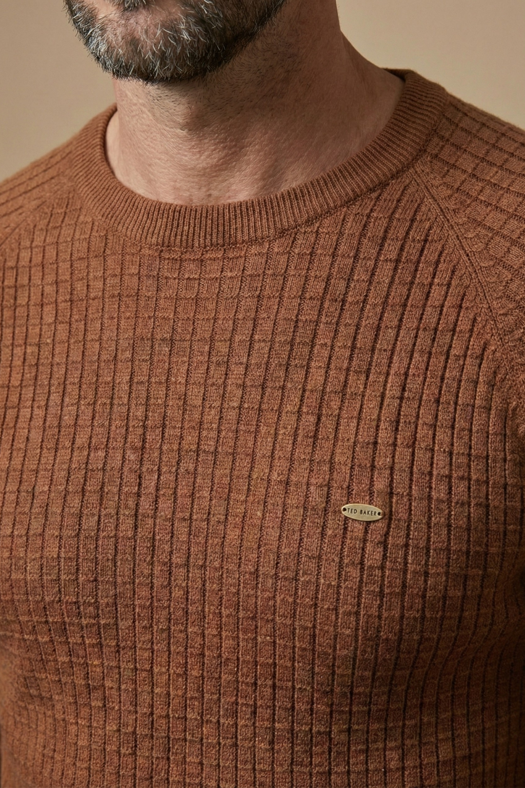Design: Crew neck knit jumper with all-over textured grid pattern