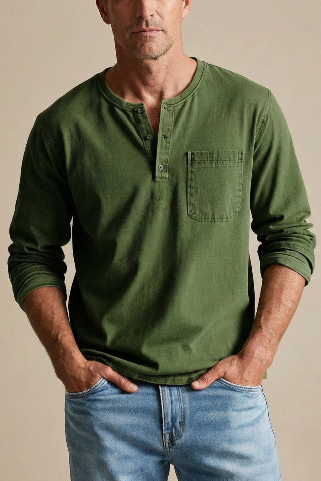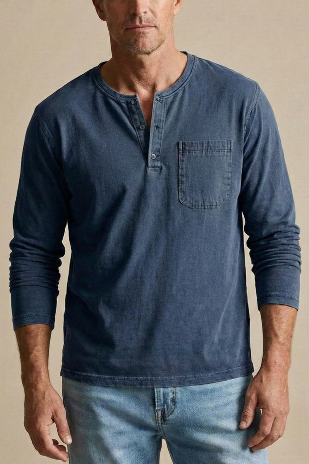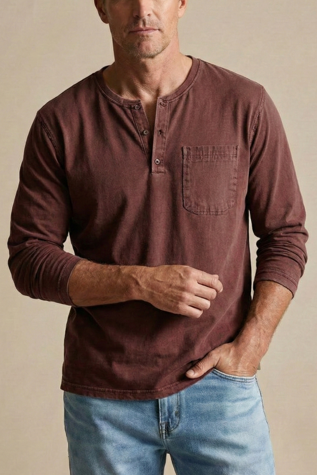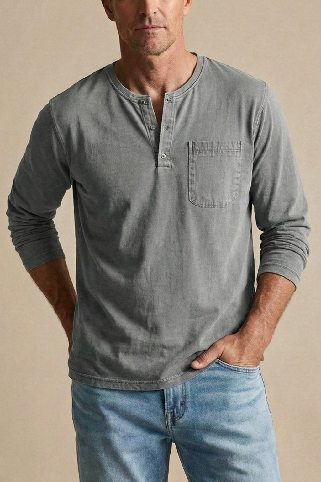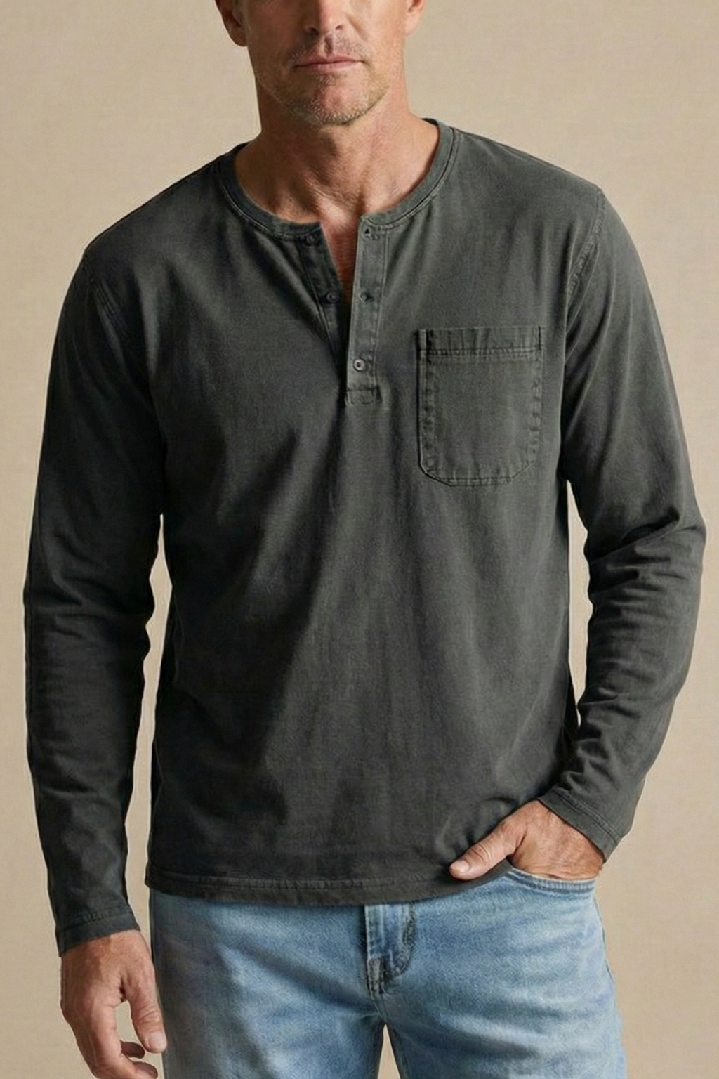 Design: Long sleeve henley shirt with button placket and chest patch pocket