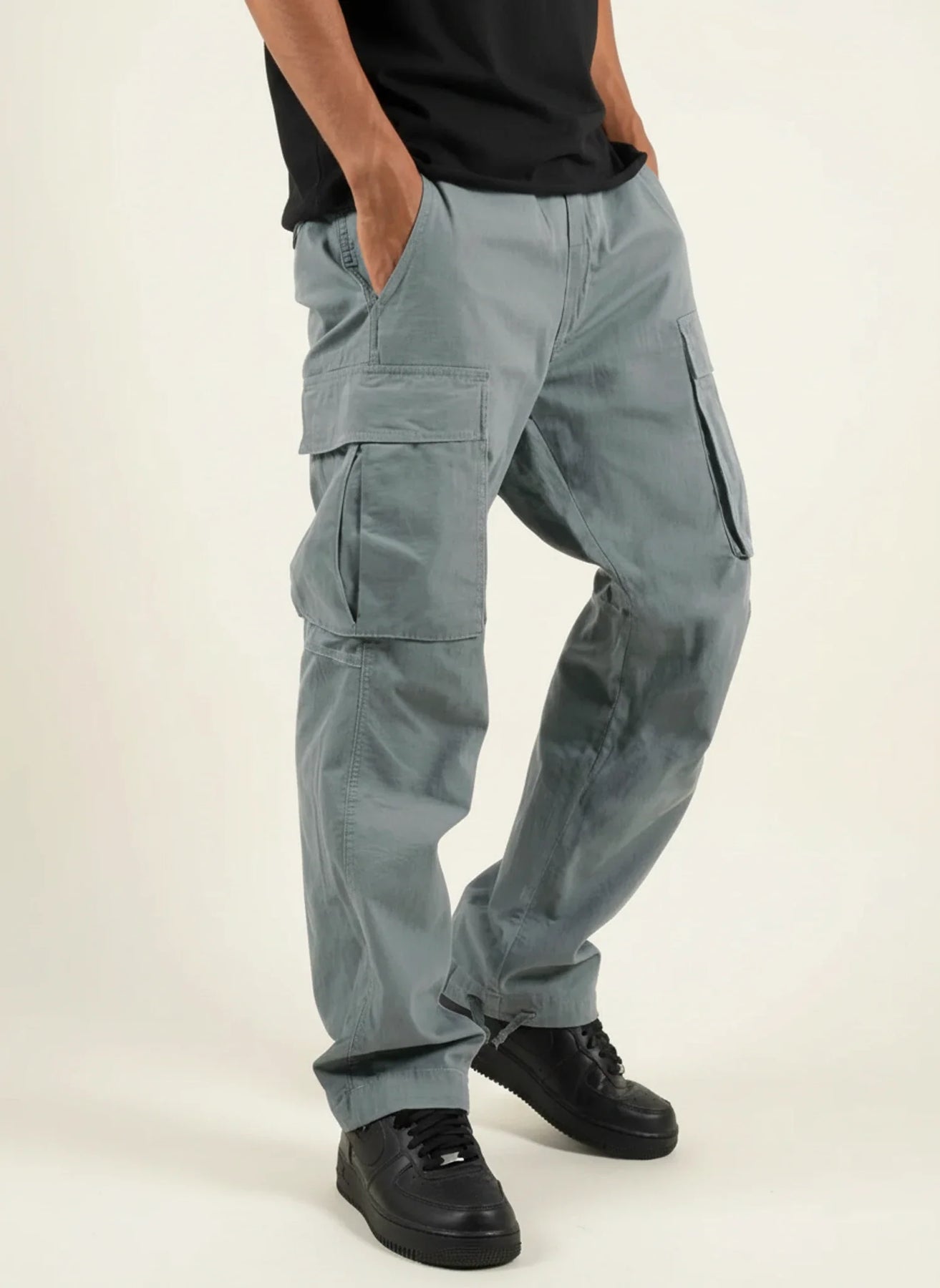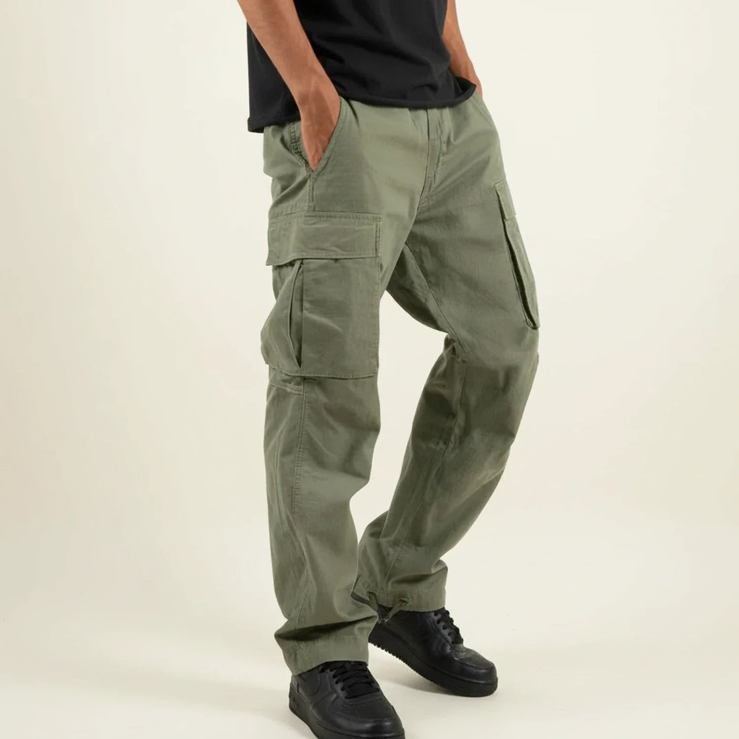 Cargo pants for men designed with a relaxed, loose-fit silhouette and a straight leg cut. The design features a mid-rise waist, front hand pockets, and multiple cargo-style pockets positioned along the thighs. Finished with reinforced seam detailing and a full-length profile, the pants present a utilitarian casual trousers design.