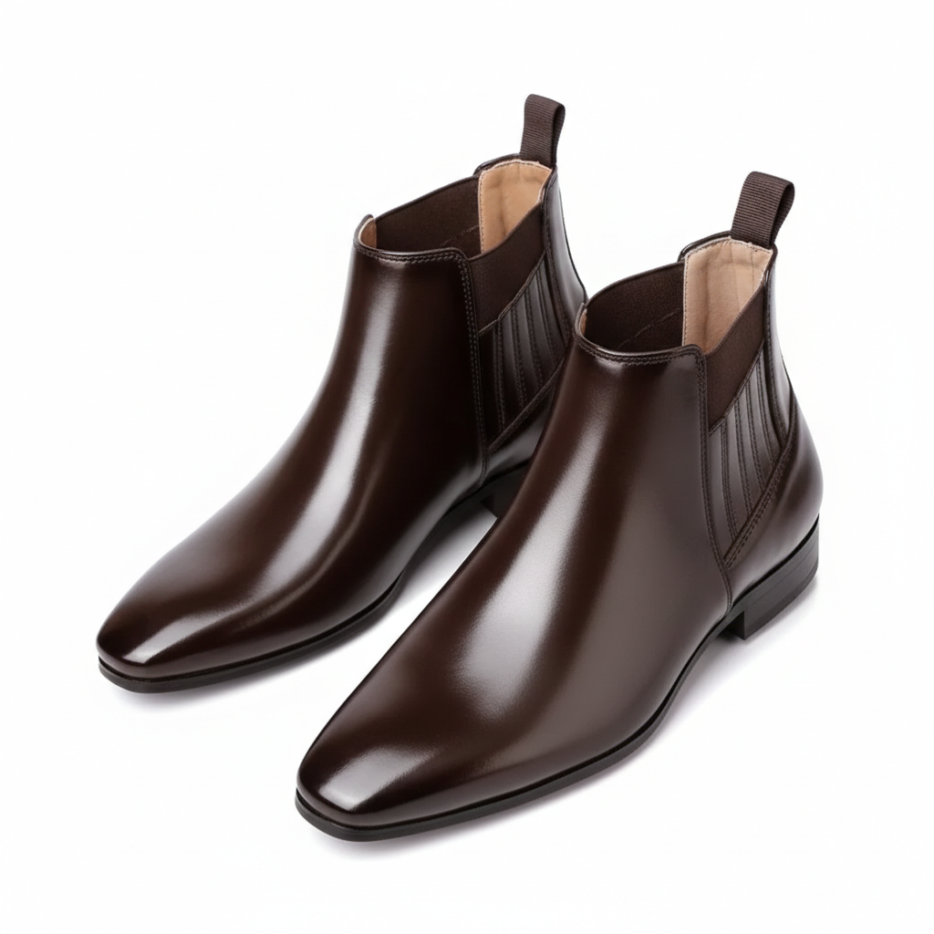 These men’s ankle boots feature a sleek pointed toe silhouette with a smooth polished finish. The side panels incorporate elastic inserts for a streamlined look, complemented by a rear pull tab for easy wear. A low stacked heel and structured outsole complete the refined profile, making them suited to formal and smart styling.