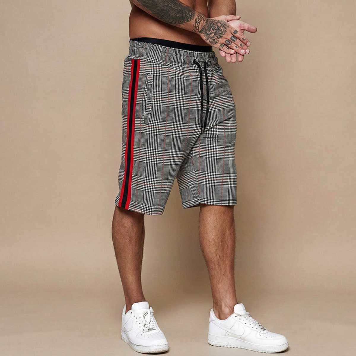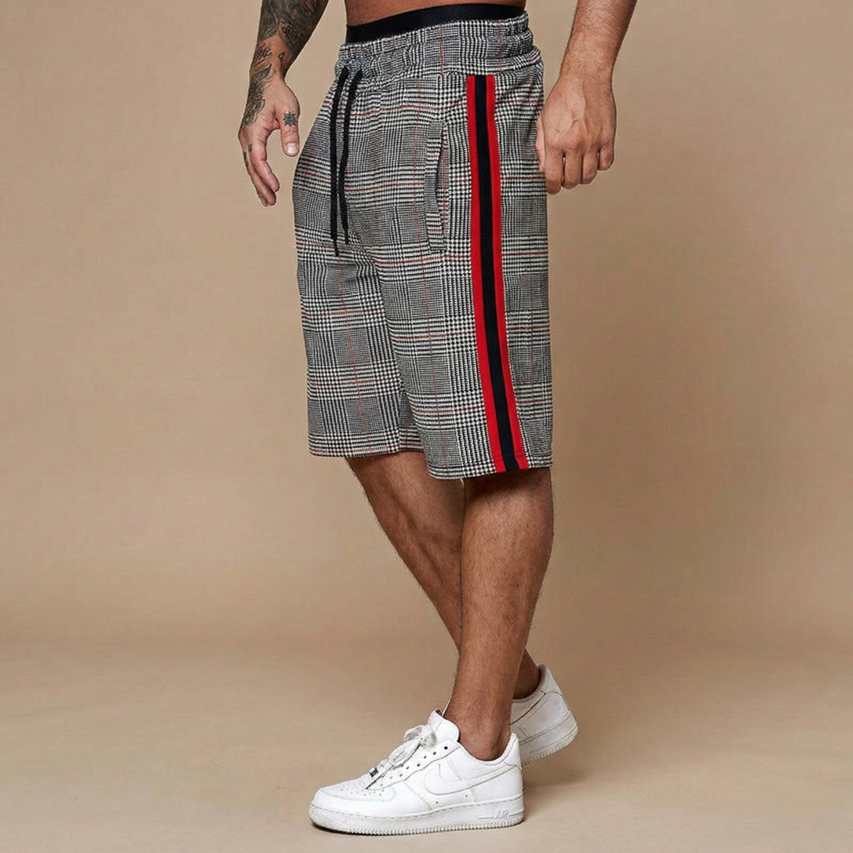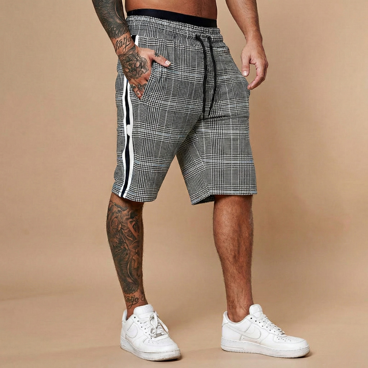 These shorts bring a sharp graphic edge to your casual rotation — plaid structure meets side-stripe detailing for a look that holds its own whether you're heading out or keeping it local. The elasticated drawstring waist ensures an easy, adjustable fit, while the above-knee length keeps the silhouette clean and current. A versatile piece that moves as effortlessly as your weekend does.