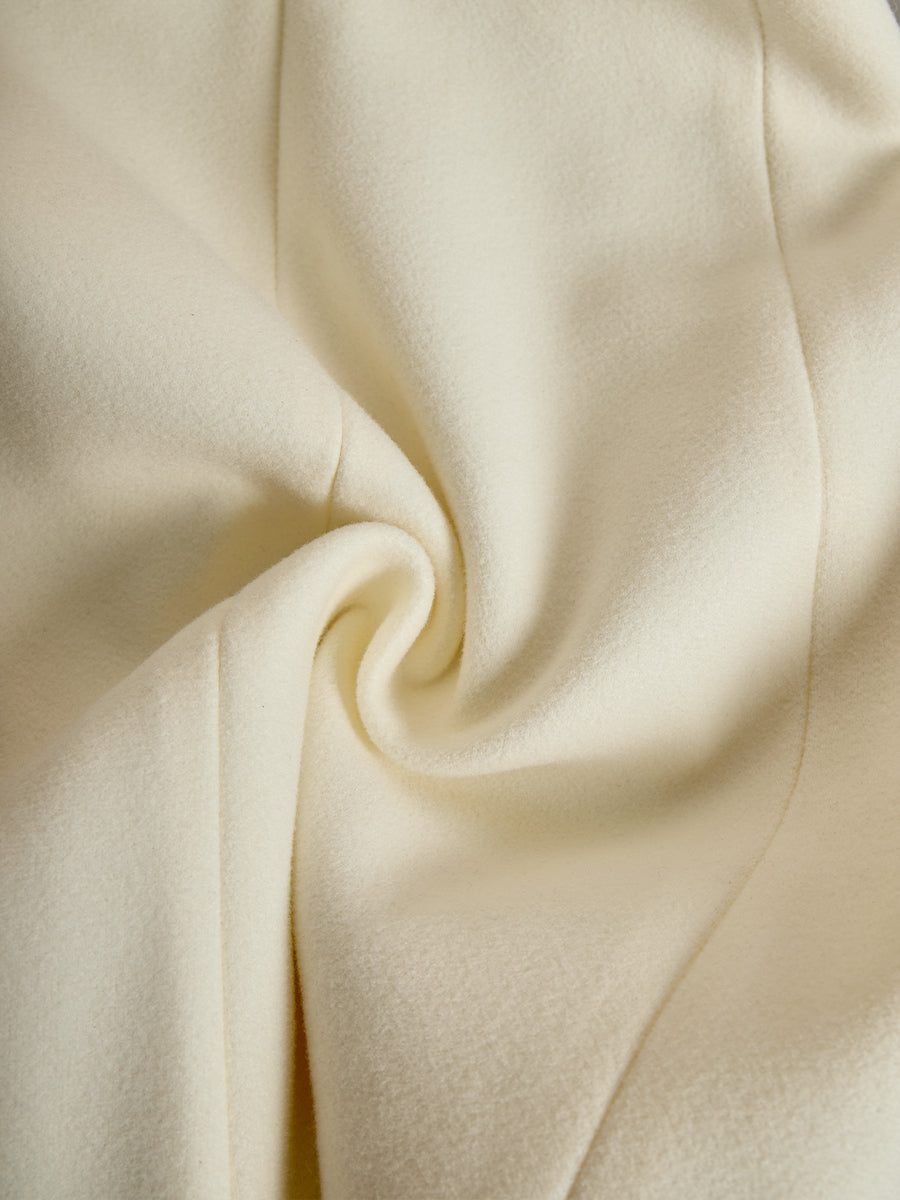 This women’s midi coat features a structured fitted bodice with a flared skirt silhouette that falls below the knee. It is designed with a wide faux fur collar and matching faux fur cuffs. The front includes a button closure, and the back maintains a clean, seam-defined finish.