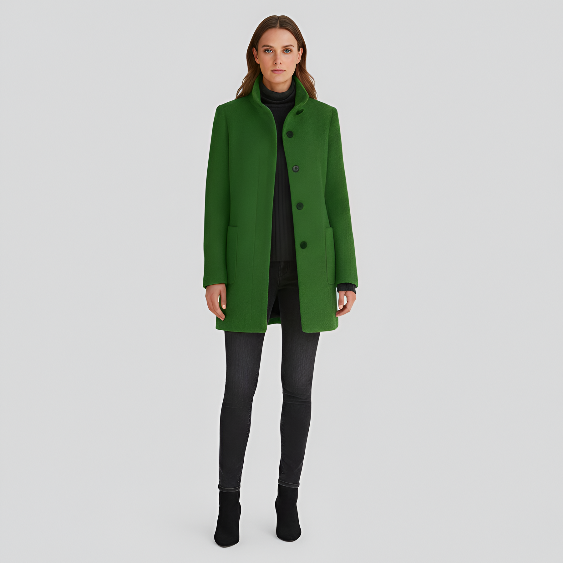 Design: Mid-length single-breasted coat - stand collar - four-button front closure - two front patch pockets - long sleeves