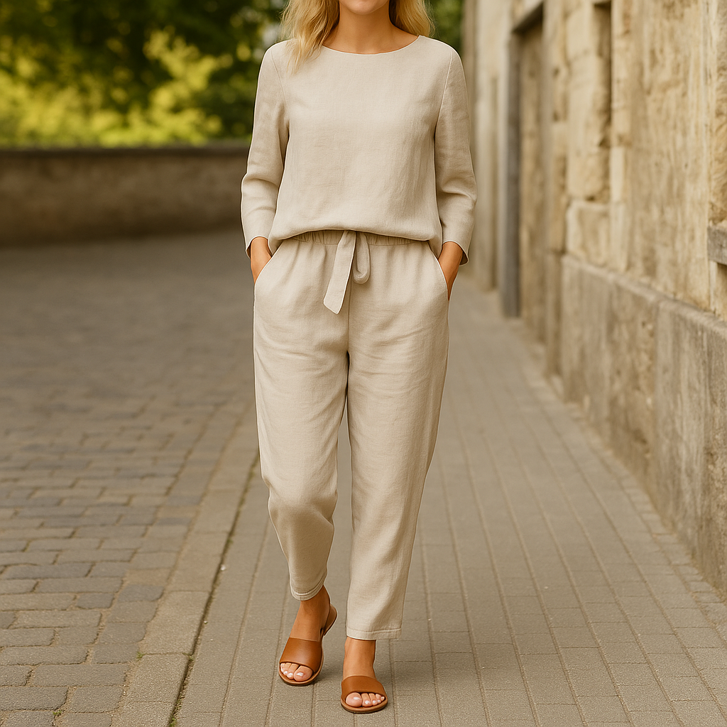 Designed for easy warm-weather dressing, this two-piece set delivers a clean, effortless look with a softly relaxed silhouette. The long sleeve top pairs naturally with drawstring pants to create a balanced outfit that moves with ease from daytime errands to laid-back evenings. Refined yet unfussy, it’s a versatile summer staple that feels put together without trying too hard.