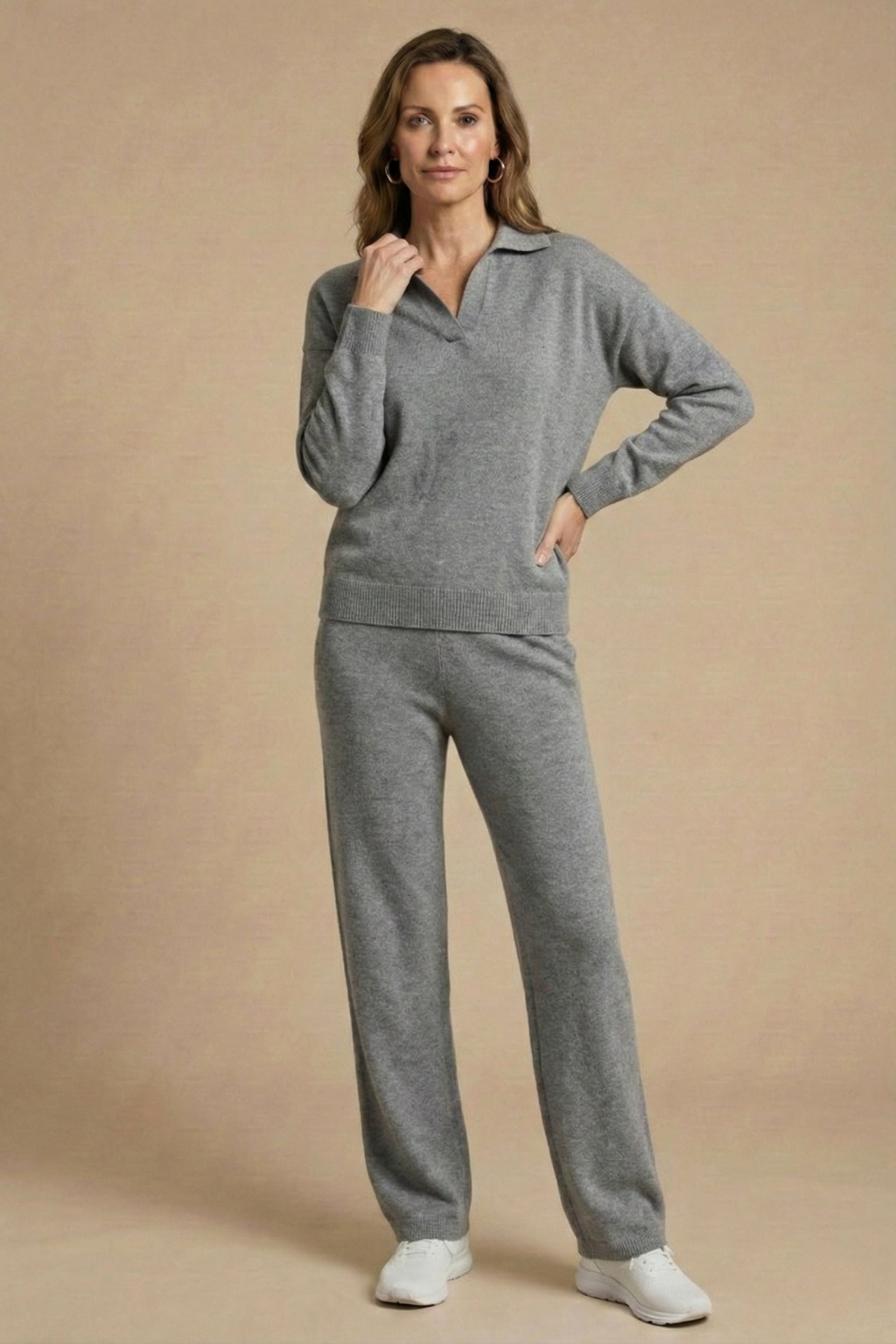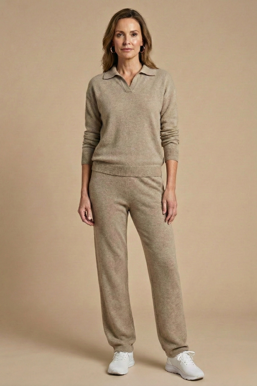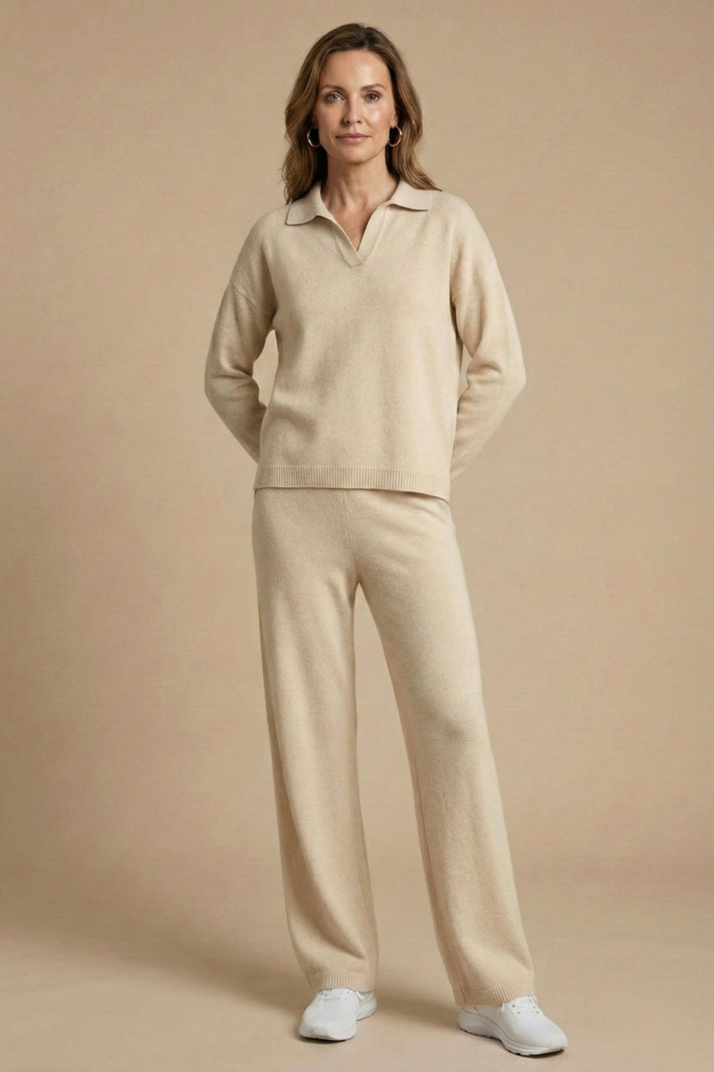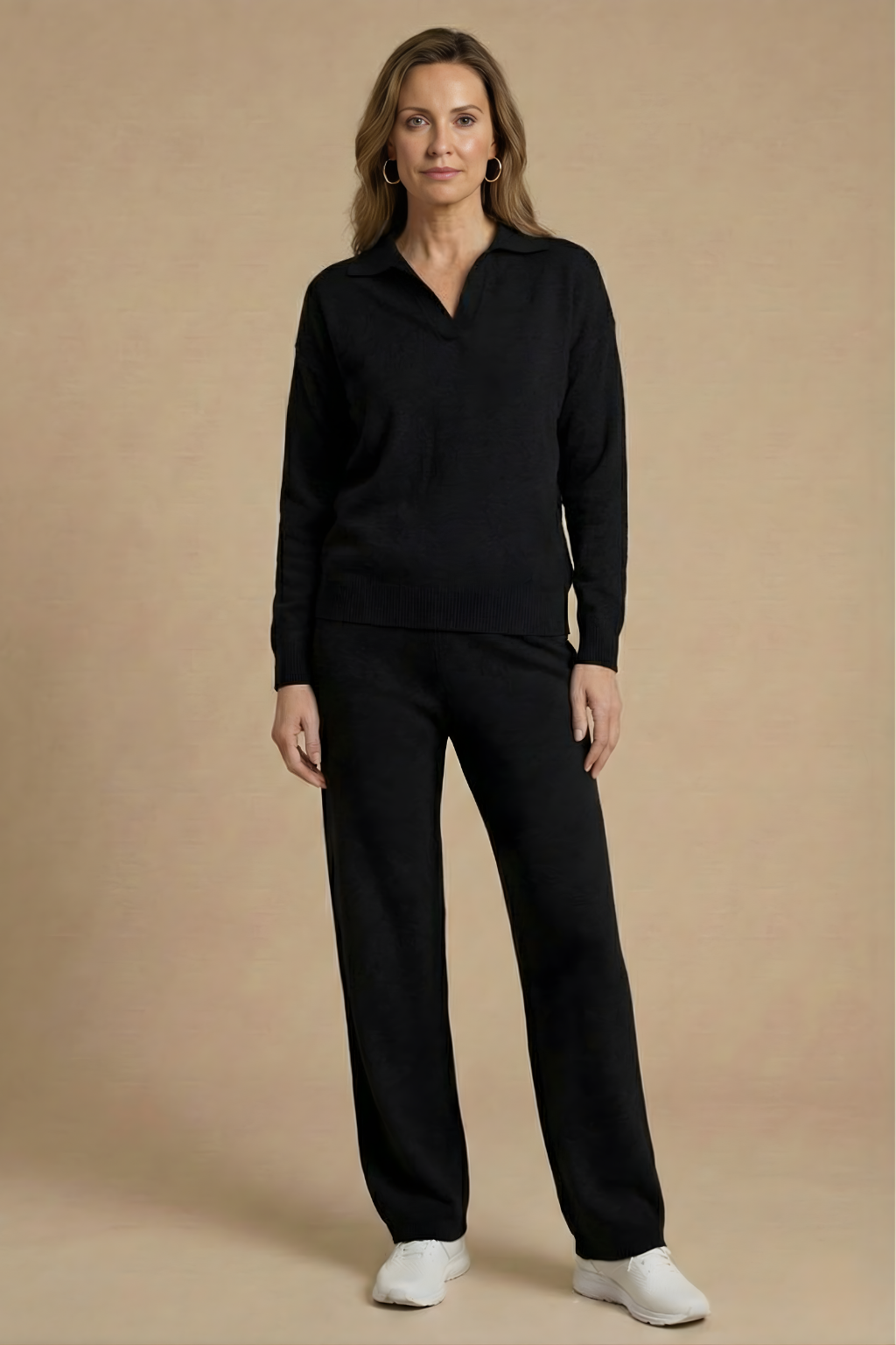This women's relaxed co-ord set combines a soft collared long-sleeve pullover with fluid straight-leg pants for effortless everyday style. The clean neckline and gently structured silhouette create a refined yet comfortable look, while the easy drape of the trousers enhances movement and balance. Designed for laid-back days with a polished finish, it blends comfort and versatility seamlessly.