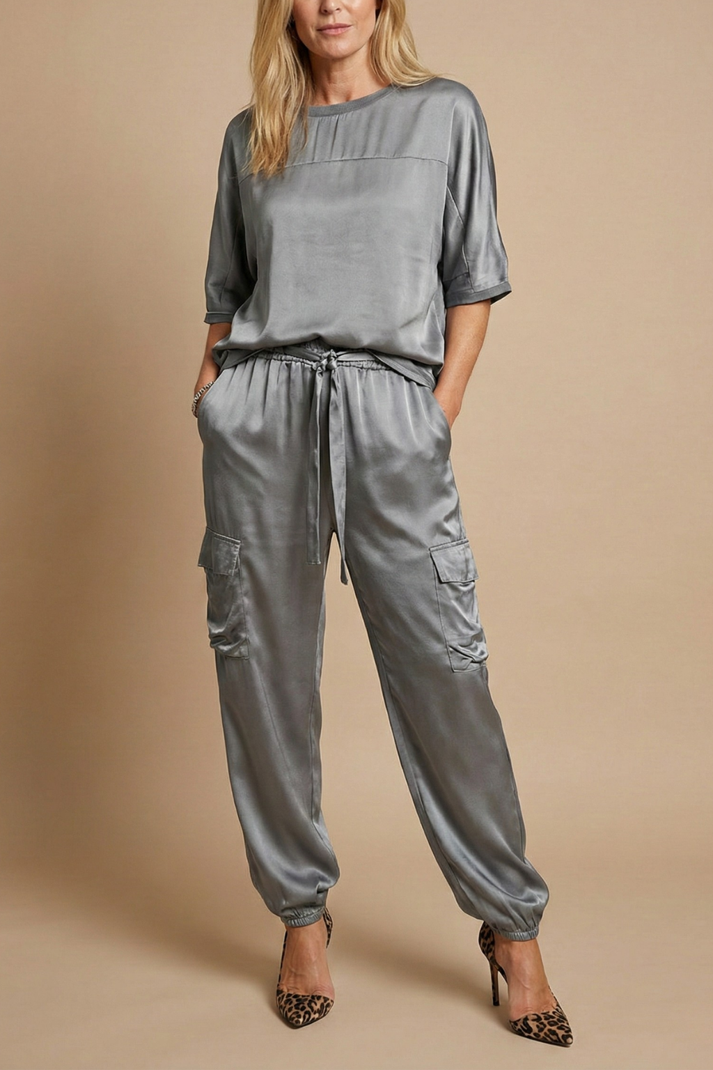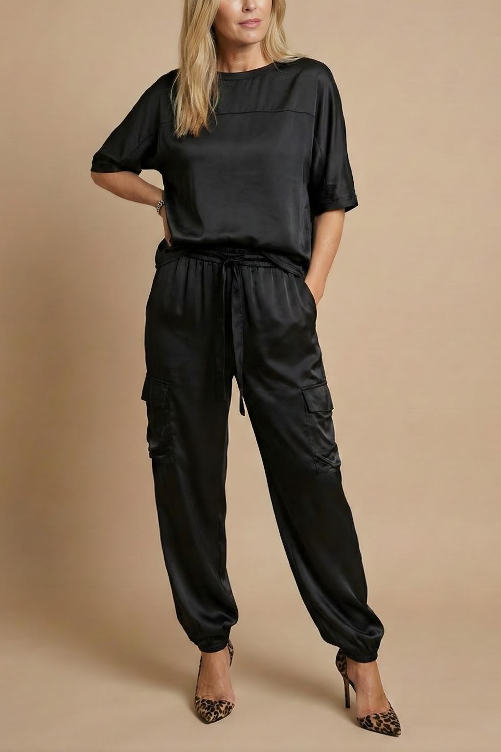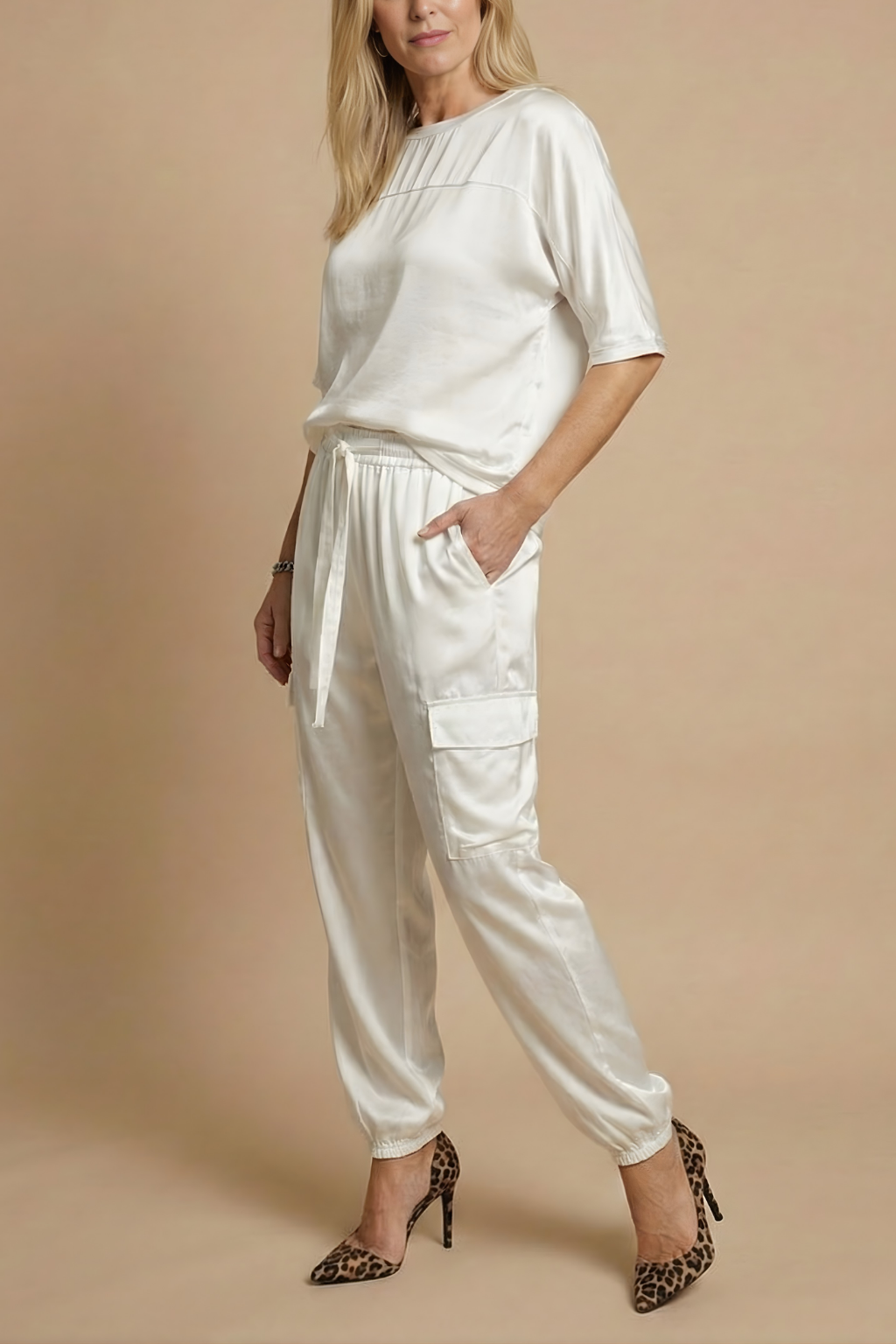 A coordinated set designed with a relaxed short sleeve top and matching drawstring waist trousers for a balanced silhouette. The round neckline creates a clean upper shape, while the cargo-style pants feature side flap pockets and a straight leg cut. An effortless combination that delivers structure and ease in one complete look.