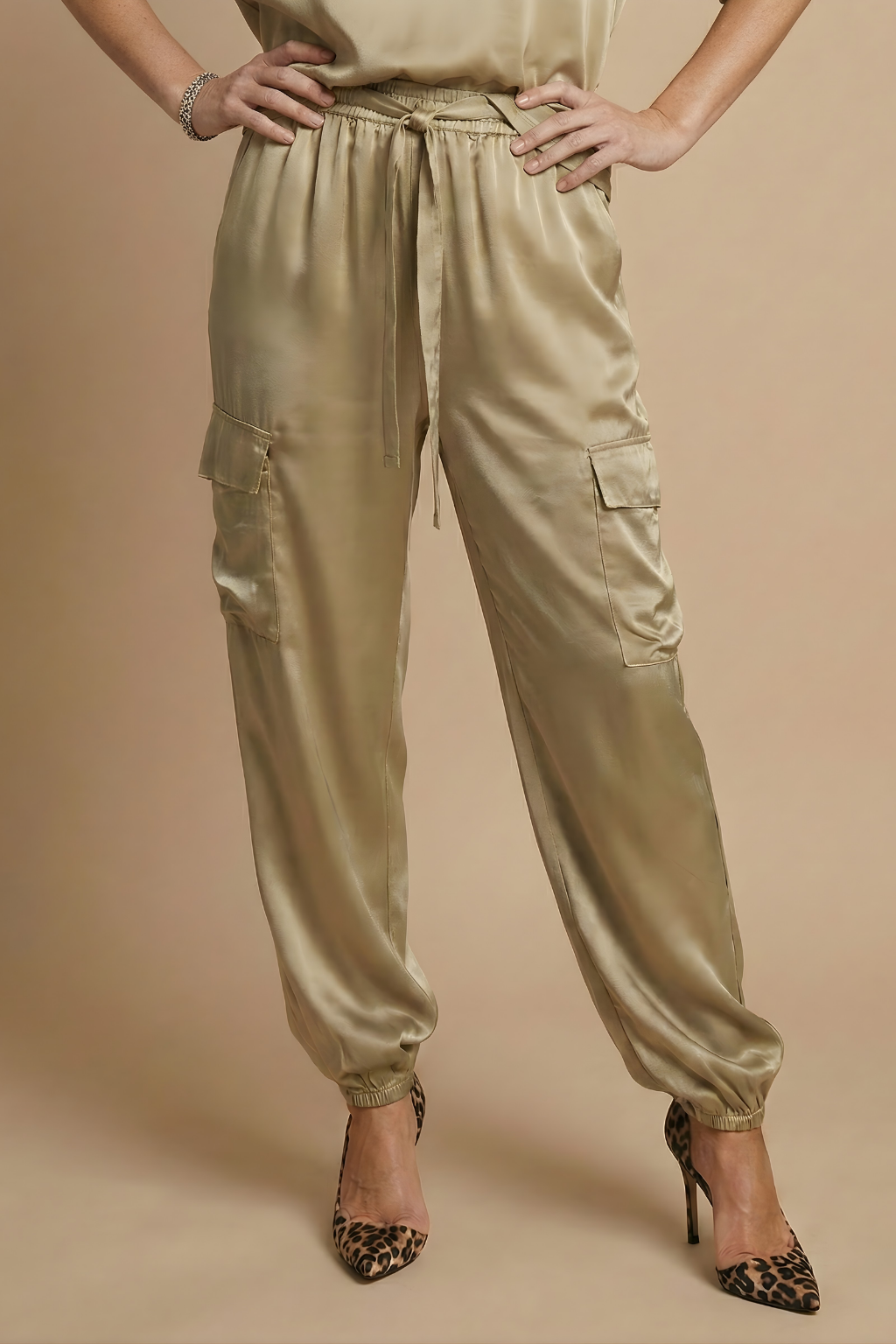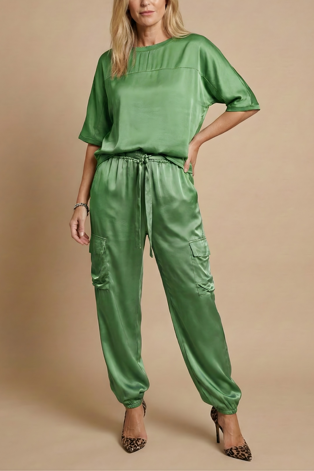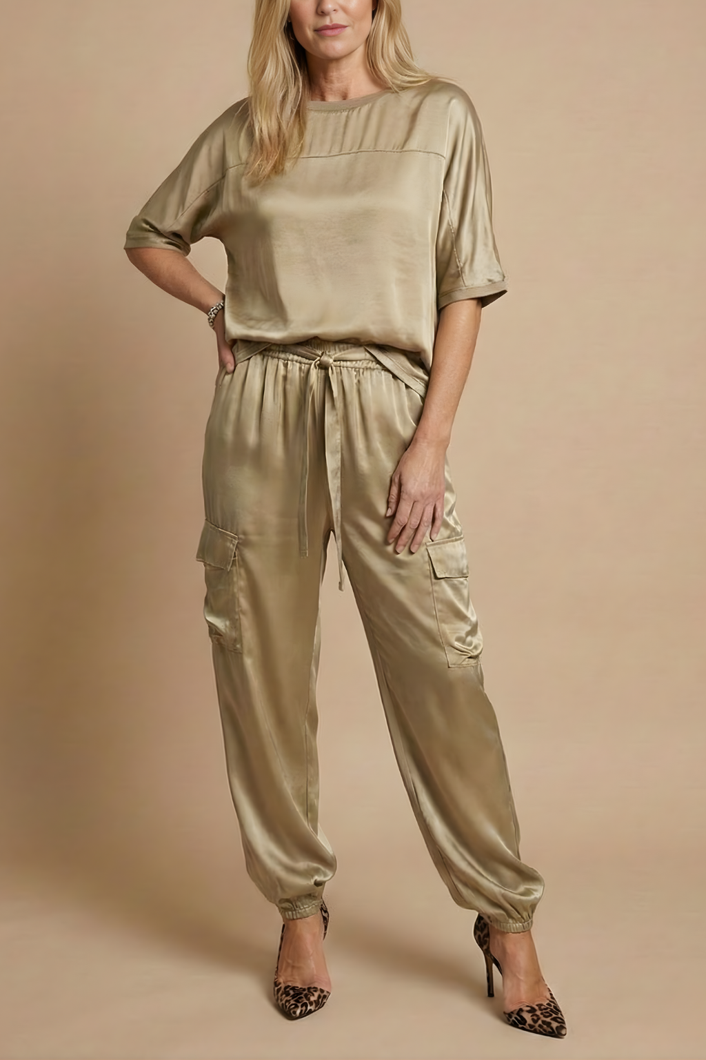 A coordinated set designed with a relaxed short sleeve top and matching drawstring waist trousers for a balanced silhouette. The round neckline creates a clean upper shape, while the cargo-style pants feature side flap pockets and a straight leg cut. An effortless combination that delivers structure and ease in one complete look.