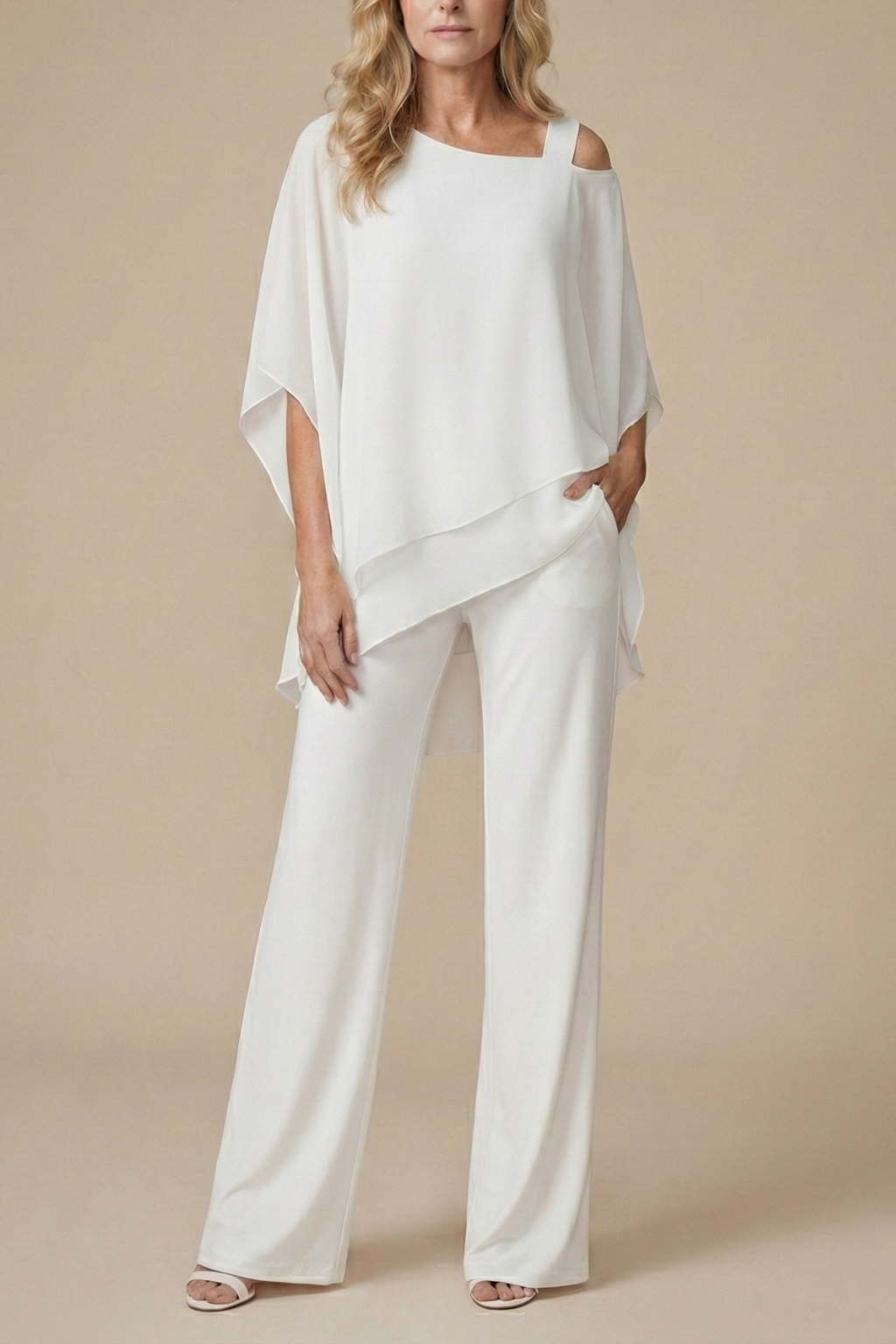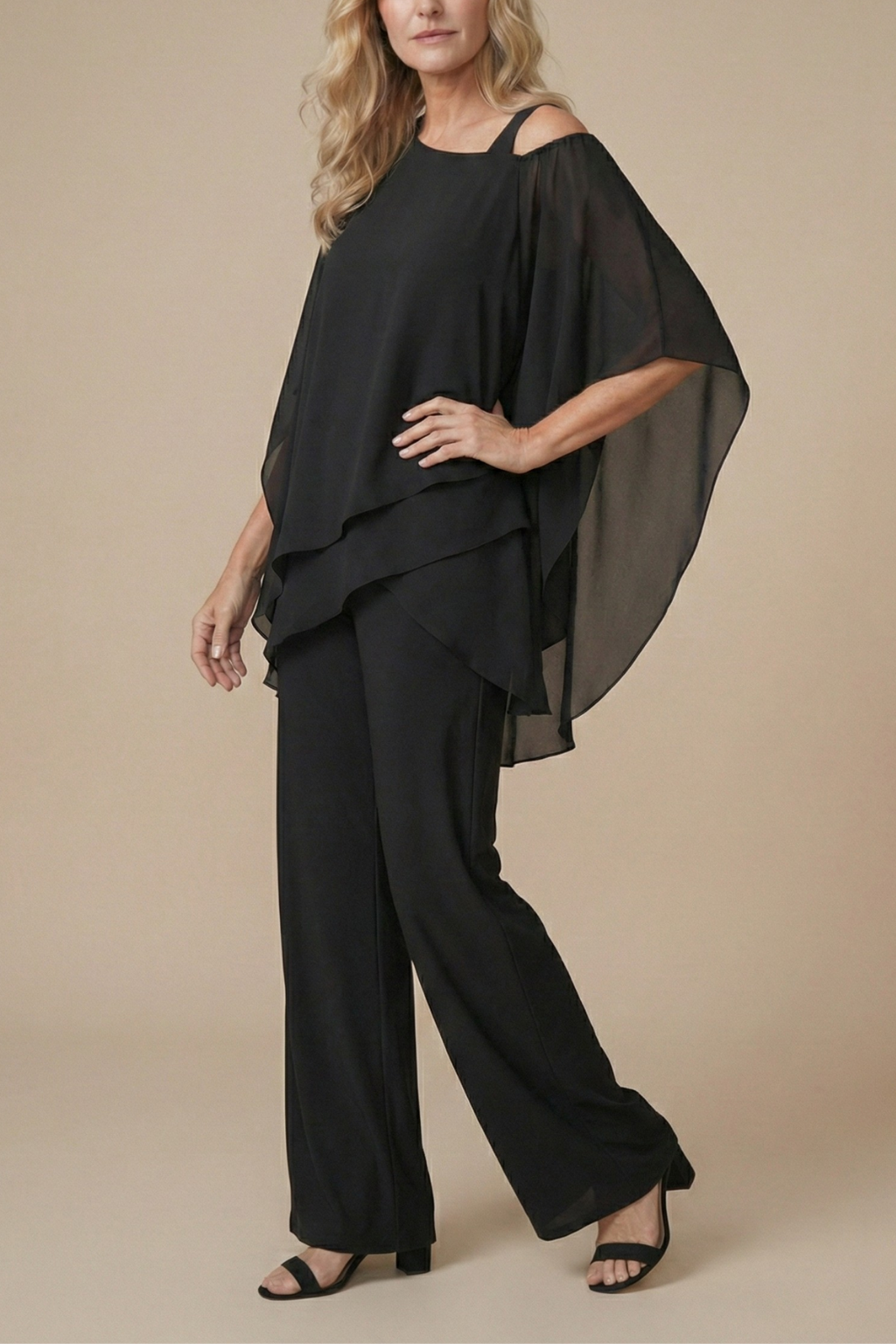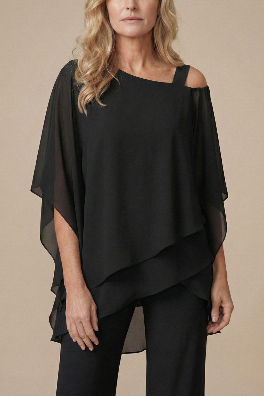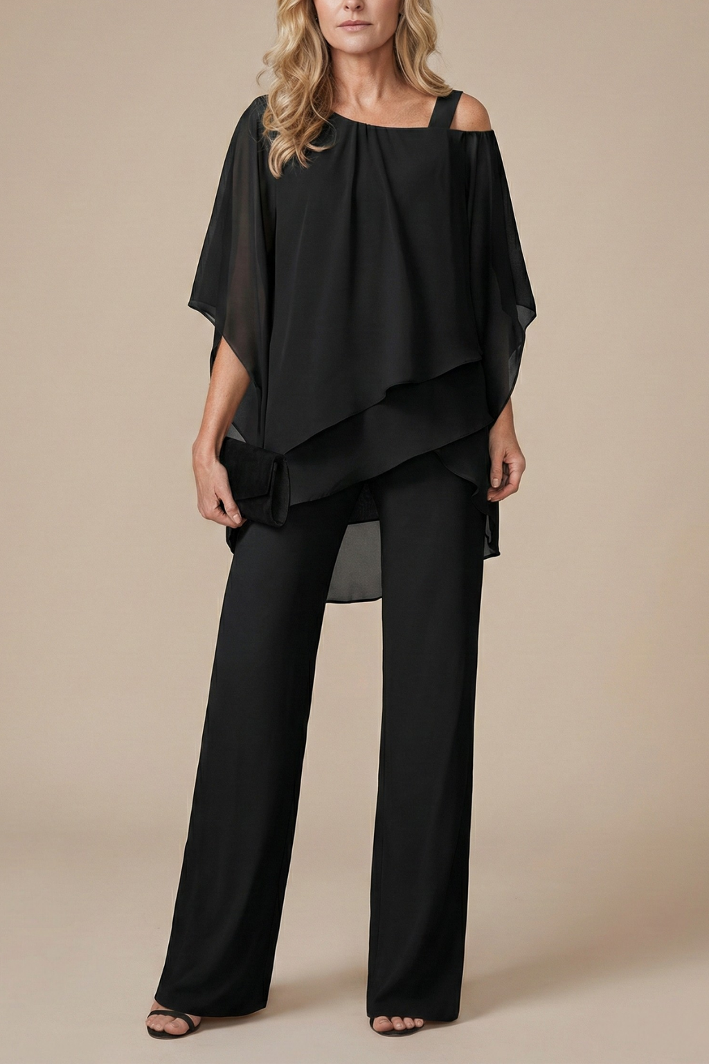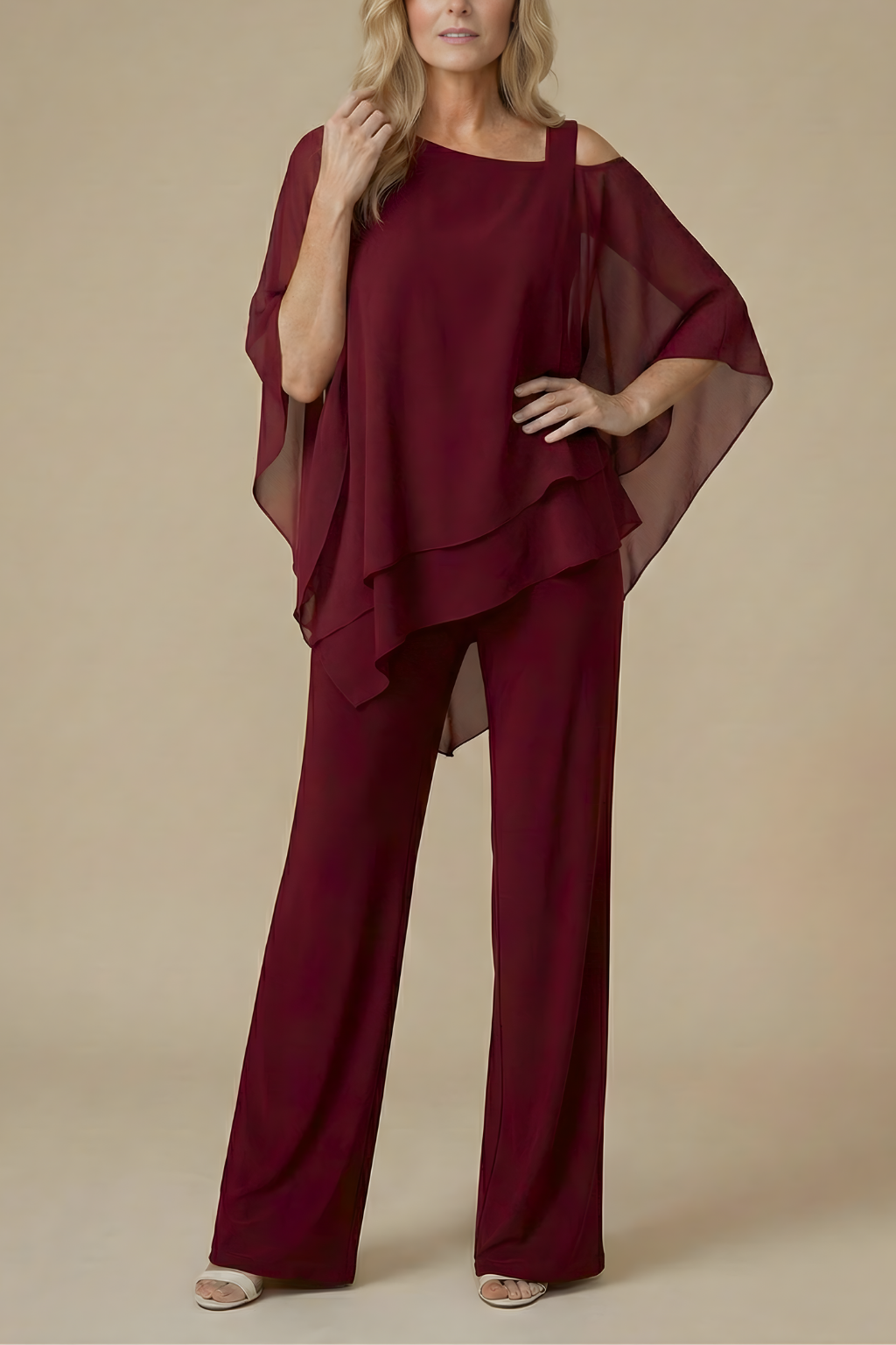 Design: Two-piece set with cold shoulder layered top and straight-leg pants