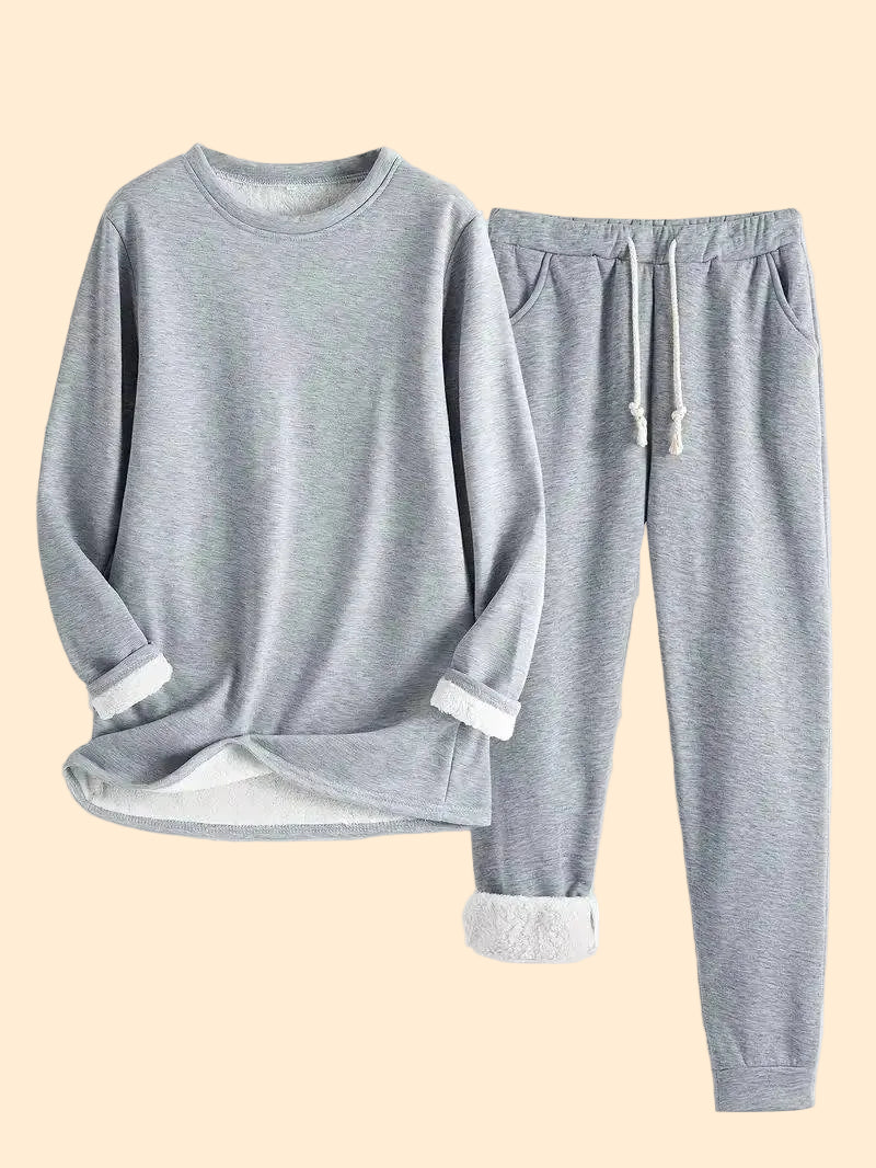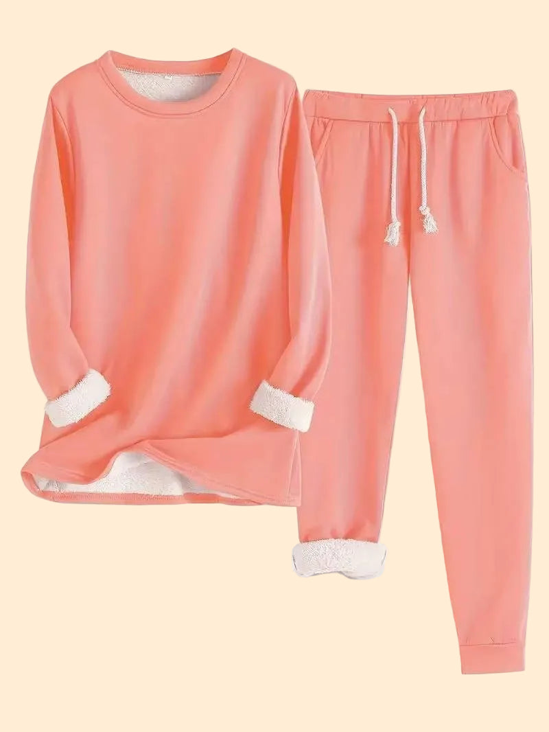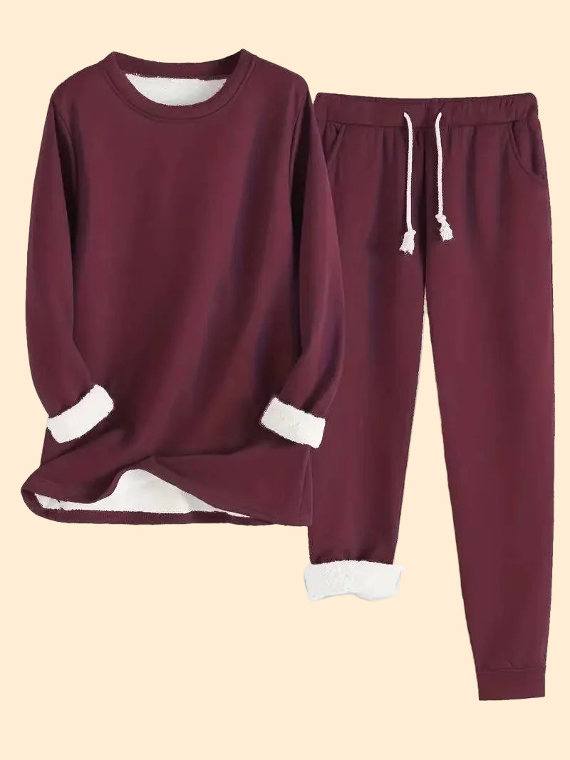 Design: Two-piece loungewear set - oversized long-sleeve crewneck top with contrast plush fleece-lined inner visible at cuffs and hem - matching tapered jogger pants with elasticated drawstring waist - side pockets - contrast plush fleece-lined ankle cuffs