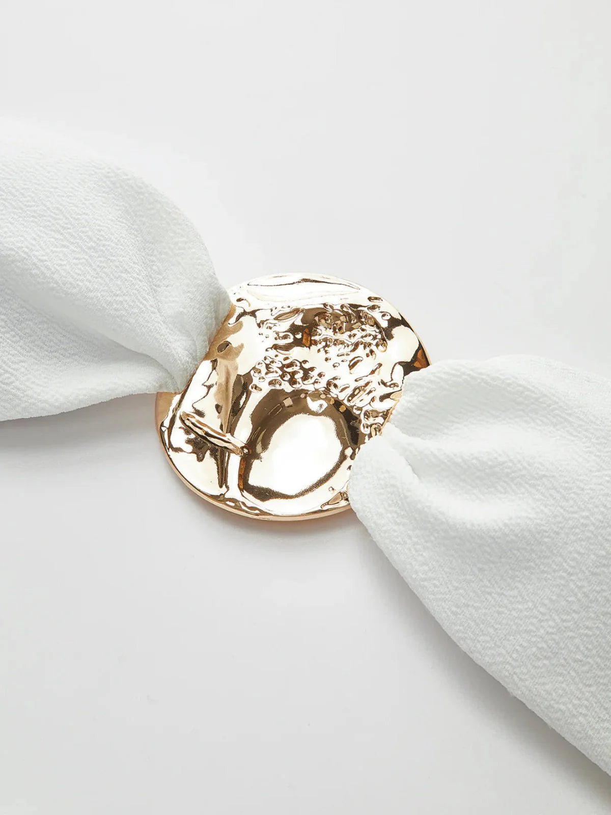 This three-piece swimwear set features a bandeau bikini top with gold medallion hardware, matching bikini bottoms, and a coordinating wrap-style cover-up, providing complete beach versatility. The bandeau top offers removable padding, while the wrap cover-up can be styled multiple ways for varied looks.